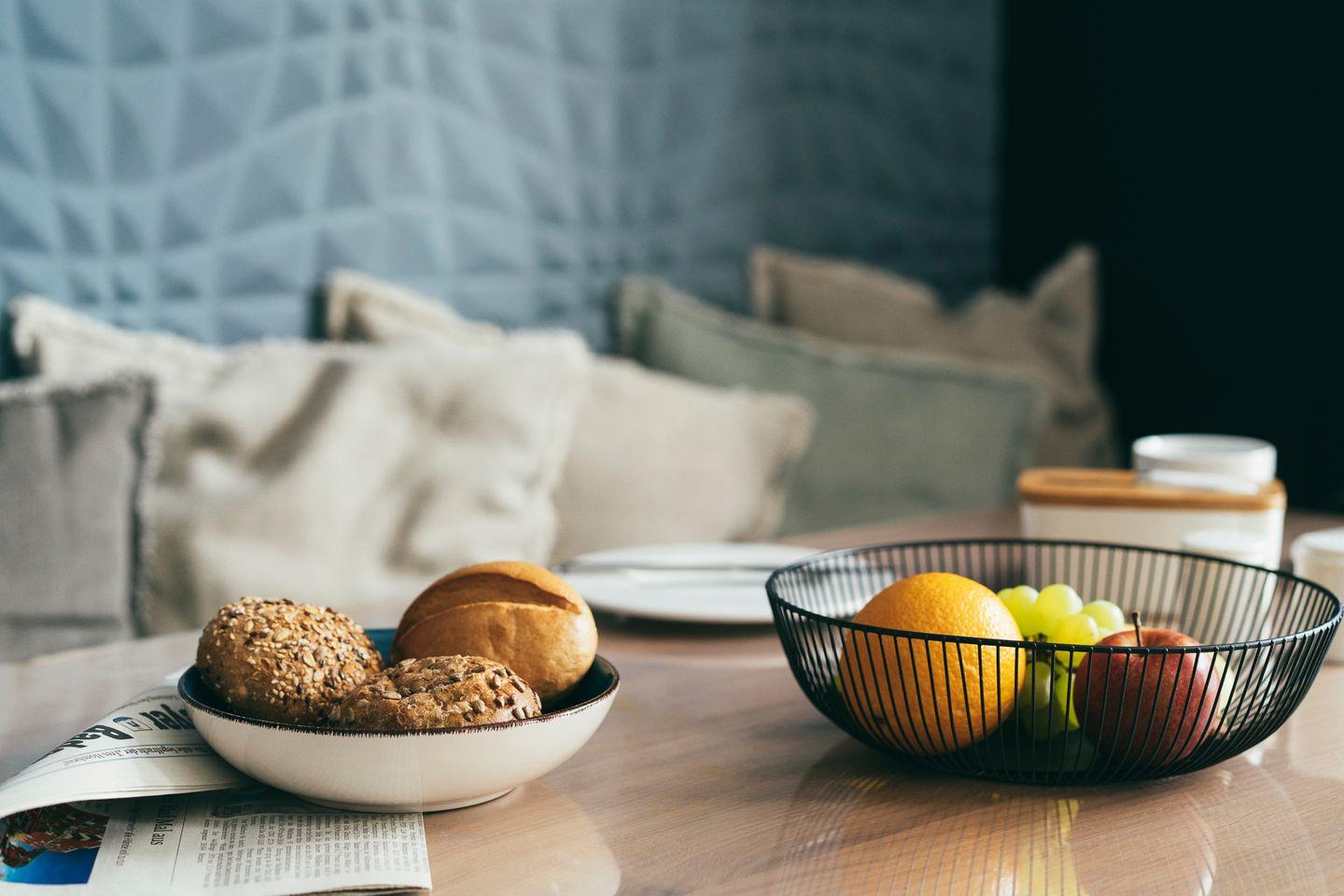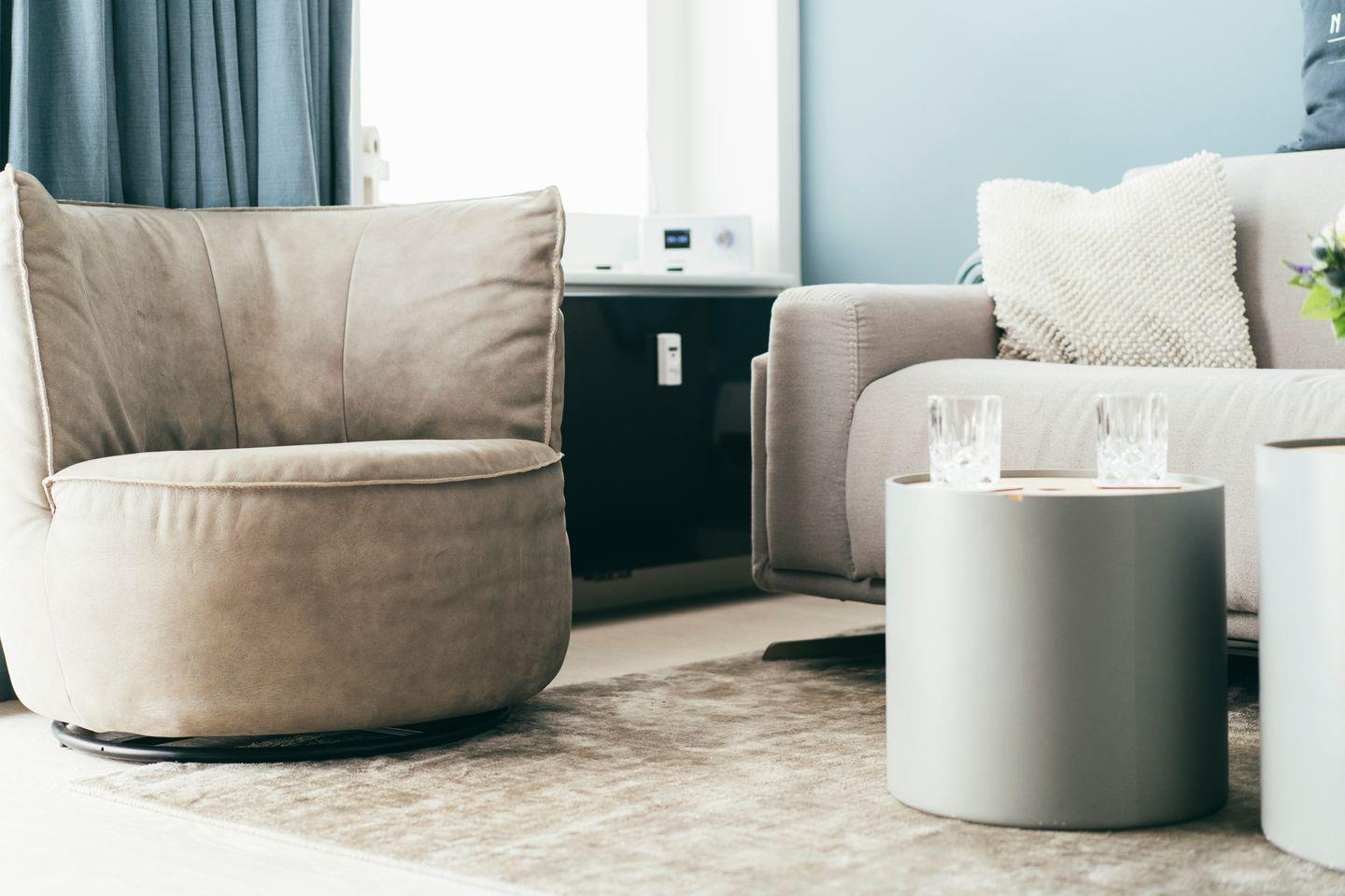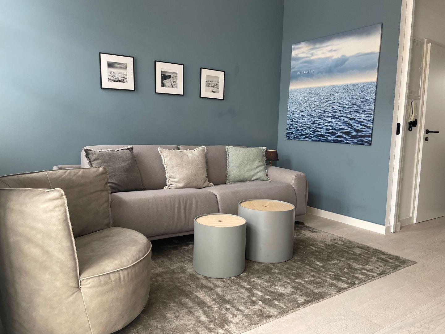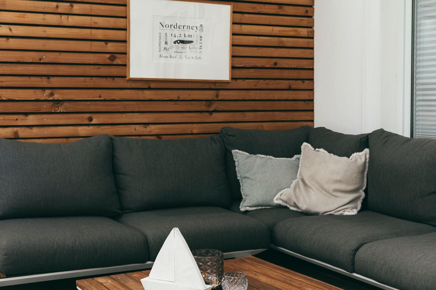 Der helle Wohnbereich ist modern und gemütlich eingerichtet. Ein bequemes Sofa lädt zum Entspannen ein und lässt sich mit wenigen Handgriffen in ein vollwertiges Schlafbett verwandeln – perfekt für eine dritte Person. Ein Flachbild-TV sorgt für entspannte Abende.