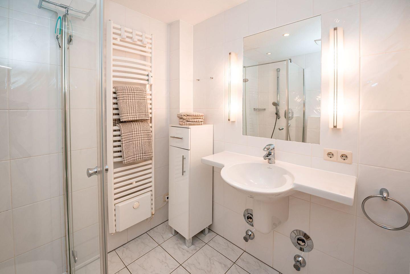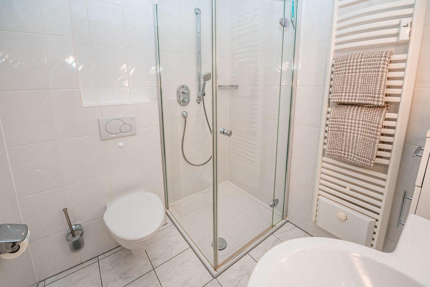 Das helle, freundlich geflieste Badezimmer verfügt über ein WC und eine Dusche mit niedrigem Einstieg.