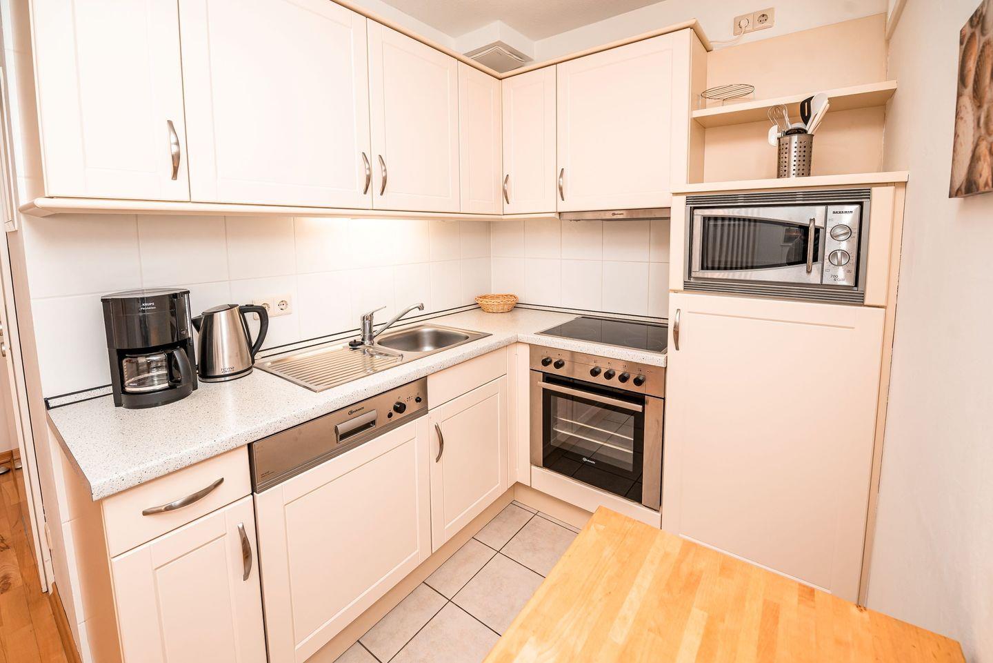 Die begehbare Küche ist modern ausgestattet und verfügt über Cerankochfeld, Mikrowelle, Geschirrspüler, Kühlschrank mit Dreisternefach sowie sämtliches Küchenzubehör, das Sie für die Zubereitung Ihrer Mahlzeiten benötigen. Der im Wohnraum integrierte Essbereich ist vor dem Fenster platziert und bietet Platz für bis zu vier Personen.