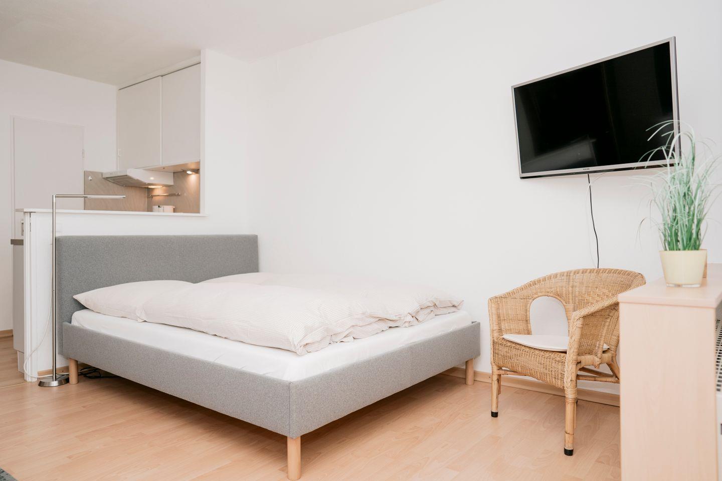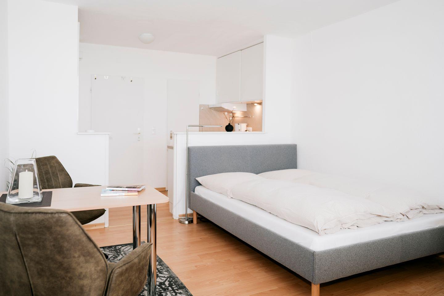 Der Wohn- und Schlafbereich ist offen gestaltet und mit einem bequemen Doppelbett, einem Essplatz sowie einer gut ausgestatteten Kochnische eingerichtet – ideal für kleine Mahlzeiten zwischendurch oder ein gemütliches Frühstück. Das moderne Badezimmer verfügt über Dusche, Waschtisch und WC.