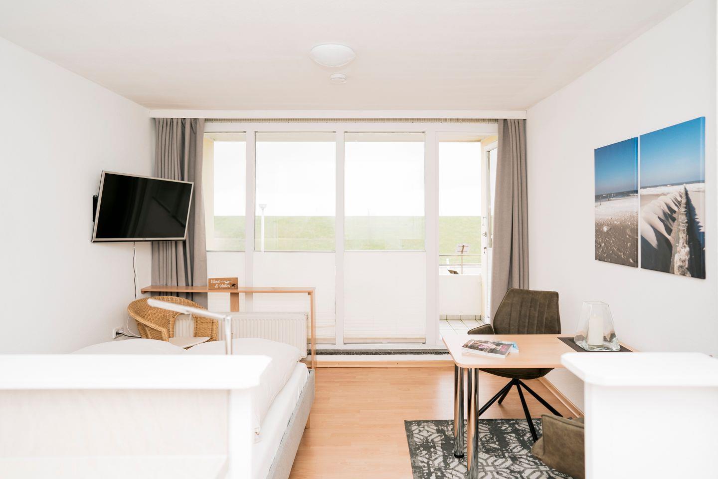 Dieses wunderschöne 1-Zimmer-Deichblickwohnung bietet auf 25qm modernen und stilvollen Komfort für bis zu 2 Personen. Unmittelbar an der Strandpromenade gelegen. Einkaufsmöglichkeiten, Restaurants und Cafés sind nur wenige Gehminuten entfernt. Erleben Sie auf dem Balkon das Meeresrauschen und einzigartige Sonnenuntergänge.