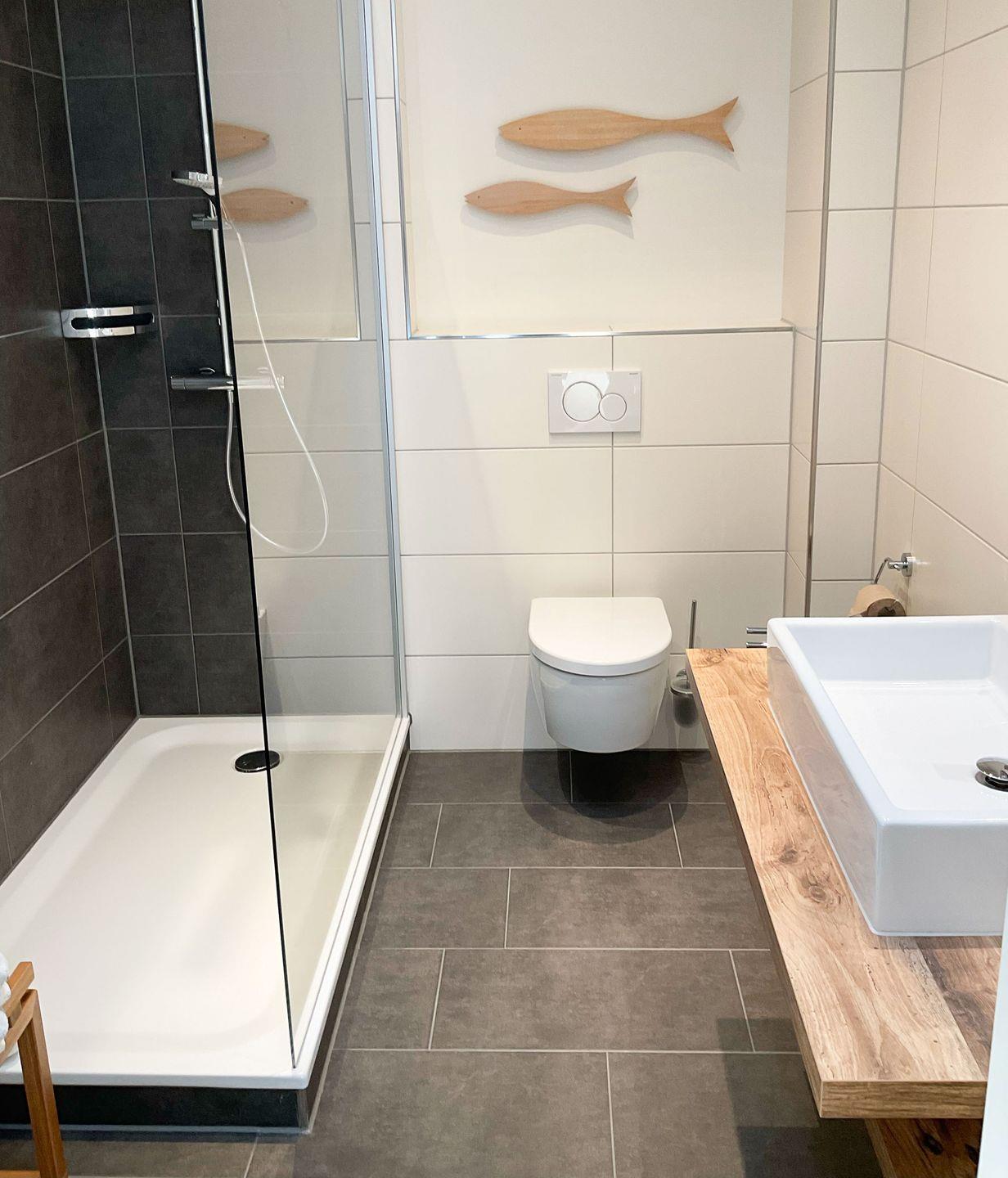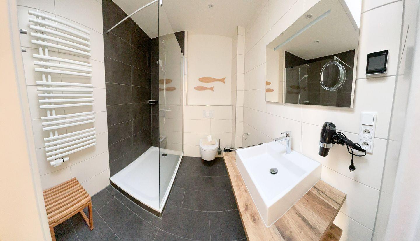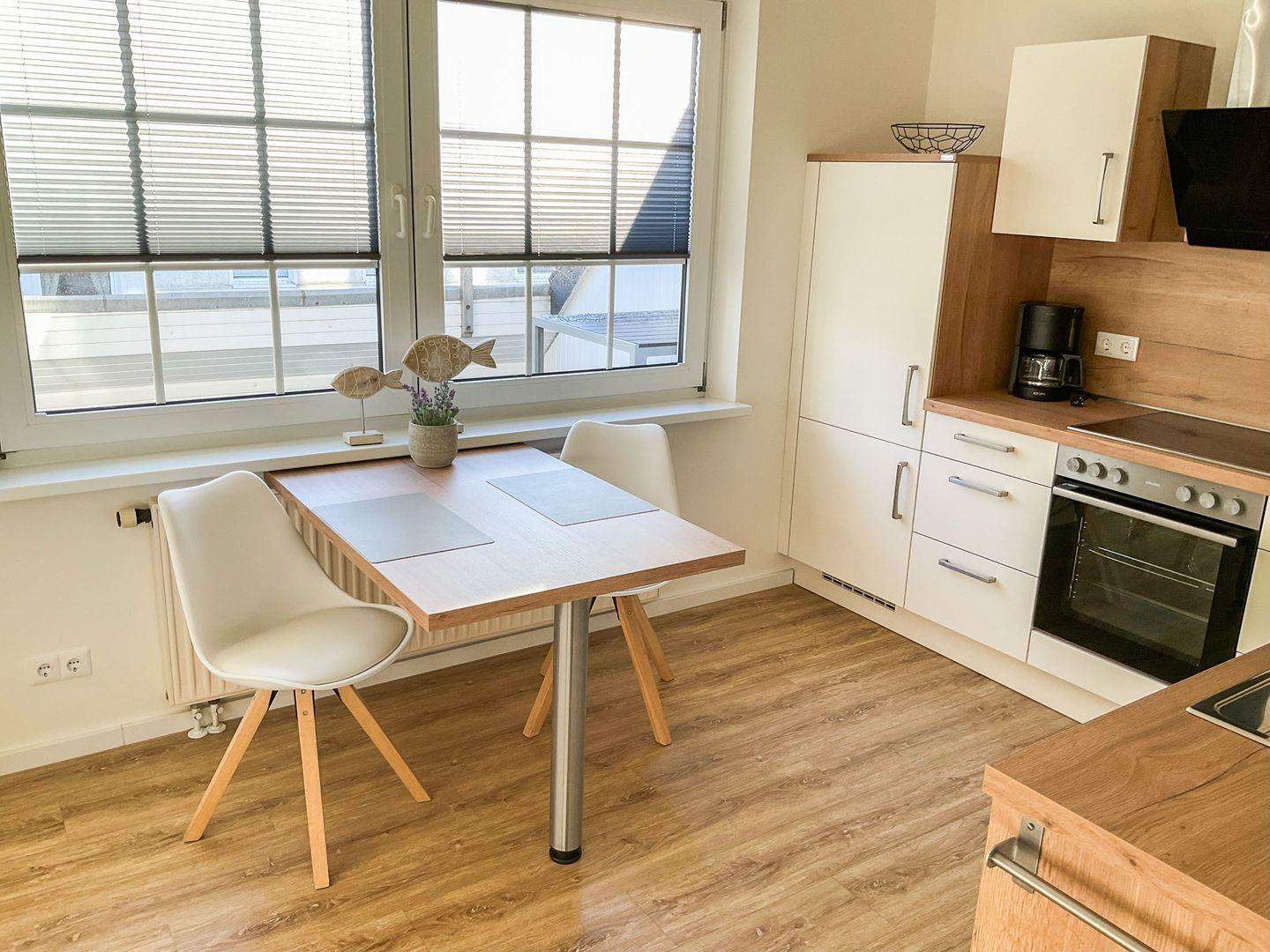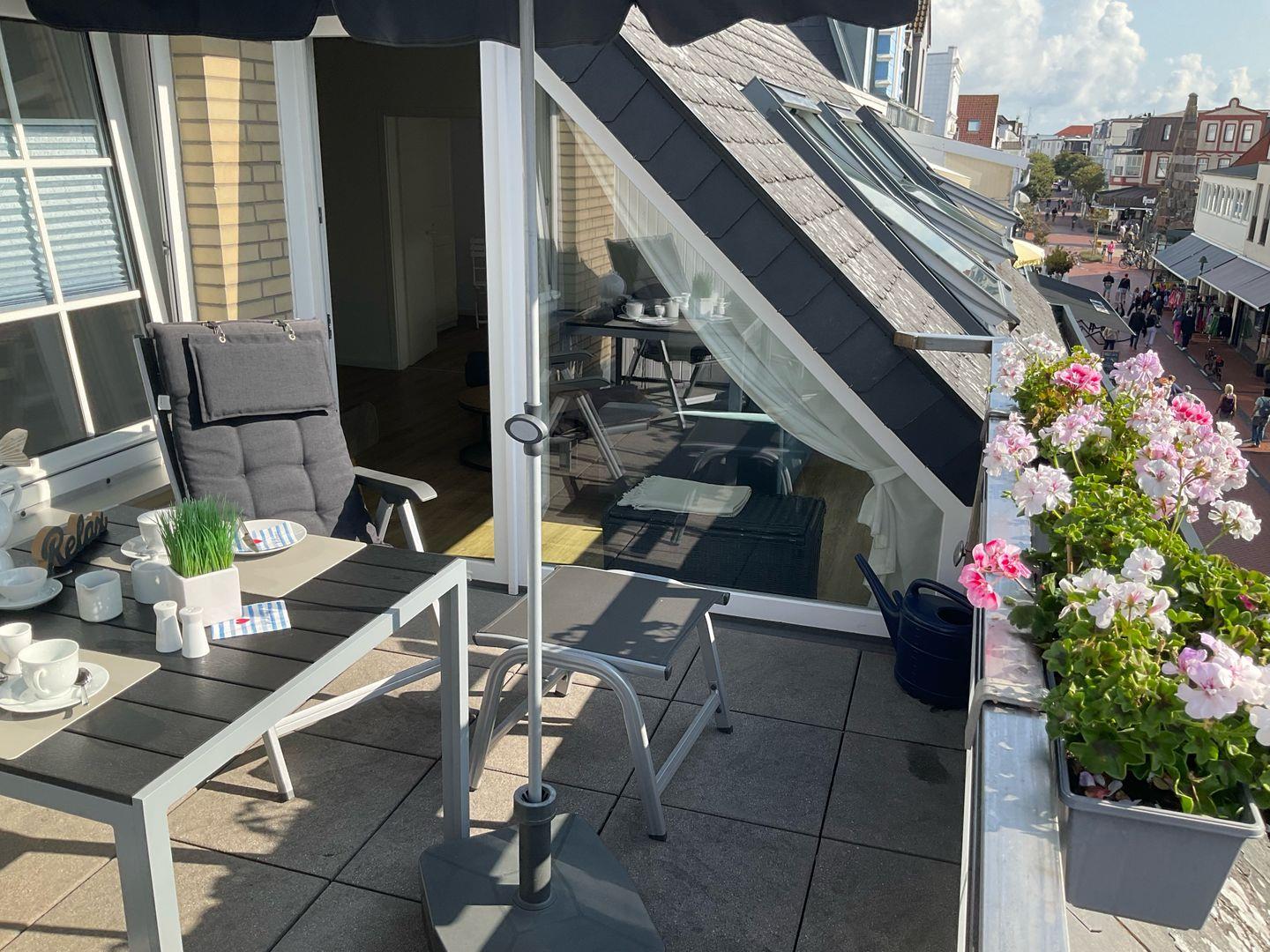 Die Wohnung im 2. OG liegt mitten im Zentrum. Das separate Schlafzimmer mit Doppelbett bietet problemlos Platz für ein eventuell benötigtes Kinderreisebettchen. Auf der vom Wohnzimmer ausgehenden Dachterrasse haben Sie ungesehen einen Ausblick auf das bunte Treiben der Friedrichstraße (Fußgängerzone). Zusätzliche Essecke. Die Küche ist separat und bietet einen Essplatz am Fenster. Das Badezimmer besticht mit einer ebenerdigen XXL-Dusche und WC.