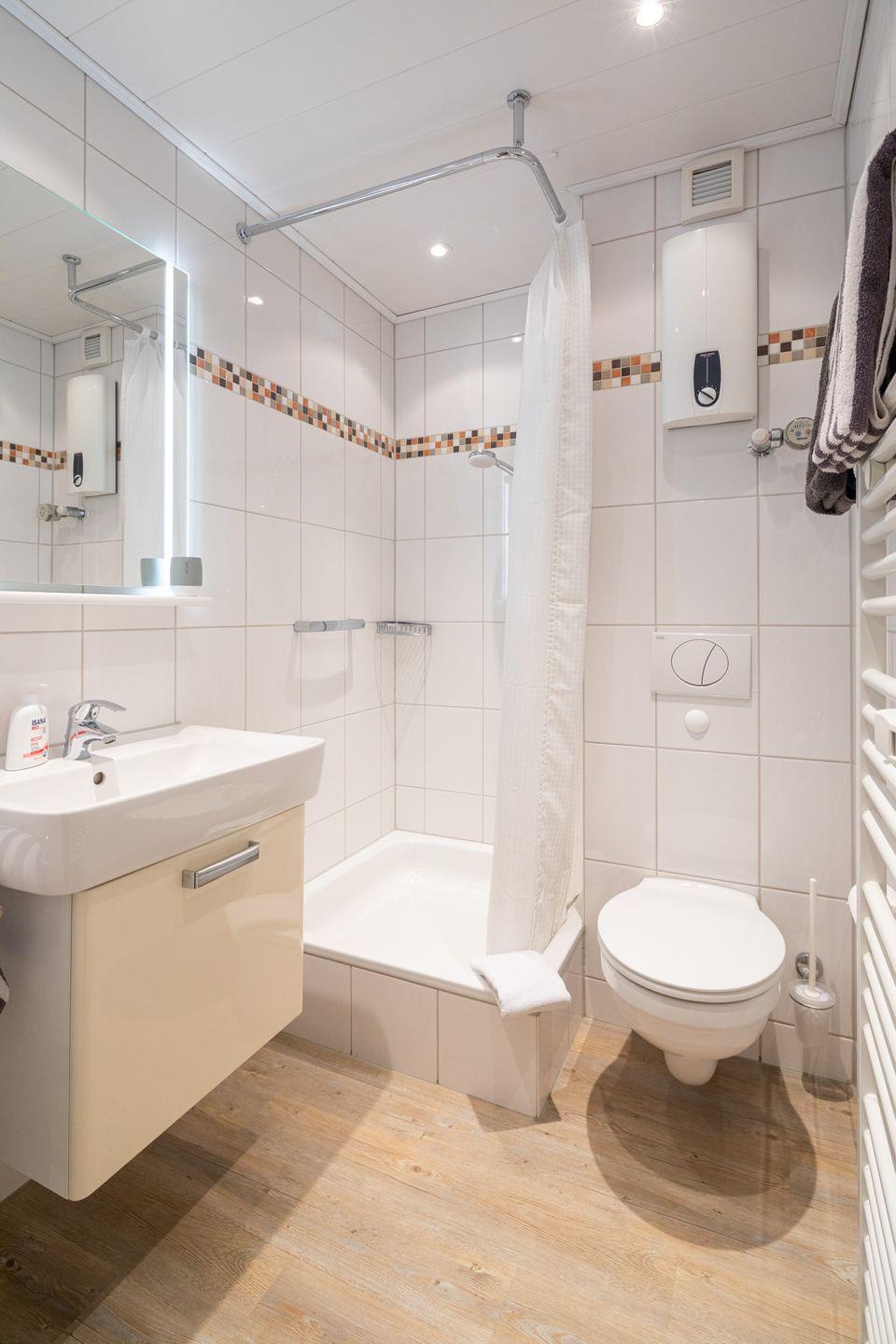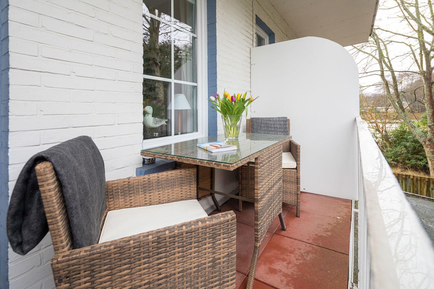 Ein besonderes Highlight des Appartements ist der private Balkon, auf dem Sie bei einem Morgenkaffee die frische Nordseeluft genießen oder den Tag bei einem Glas Wein ausklingen lassen können. Zudem finden Sie im Wohnbereich ein bequemes Sofa, einen Essbereich und einen Flachbildfernseher, ideal, um sich nach einem ereignisreichen Tag zu entspannen.