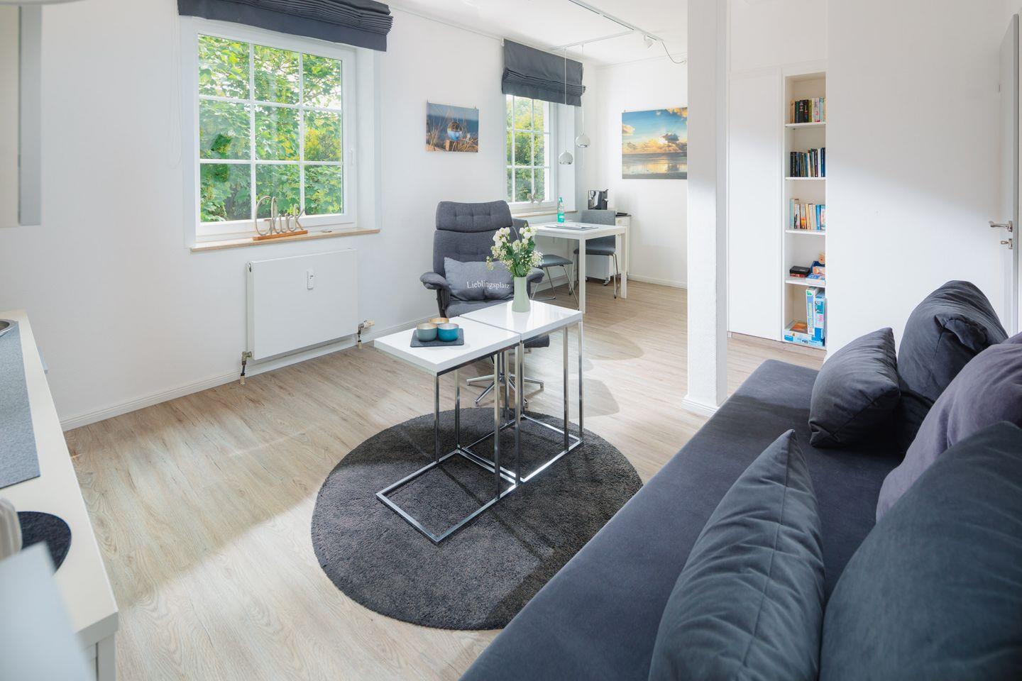 Die Ferienwohnung befindet sich im 1. Stock und verfügt über ein komfortables Schlafzimmer it einem Doppelbett (160x200cm) sowie einen hellen Wohnbereich mit einem gemütlichen Essbereich und einer offenen Küche. Die moderne Küche ist bestens ausgestattet und lässt keine Wünsche offen: Hier finden Sie alles, was Sie für die Zubereitung Ihrer Lieblingsgerichte benötigen – von Küchengeräten wie Kühlschrank, Gefrierfach, Ceranherd, Toaster, Wasserkocher bis hin zur Kaffeemaschine. Nach einer erfüllten Tagesgestaltung können Sie sich auf dem Sofa entspannen und Ihren Lieblingsfilm auf dem TV mit Kabelanschluss genießen.