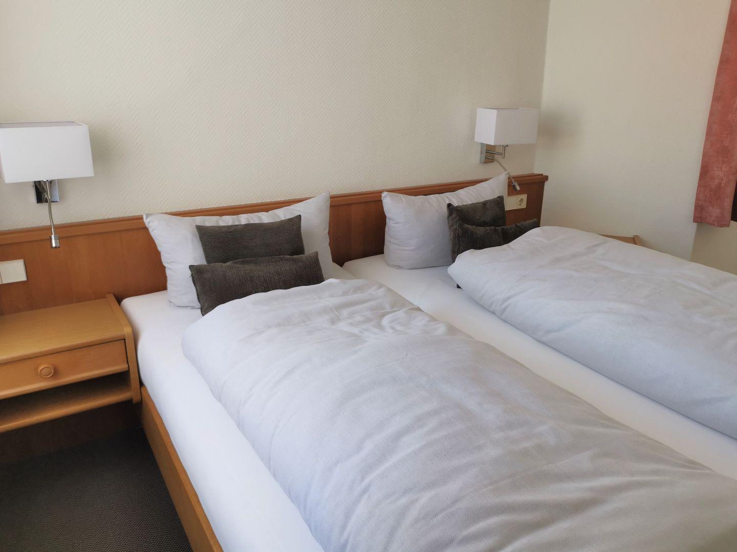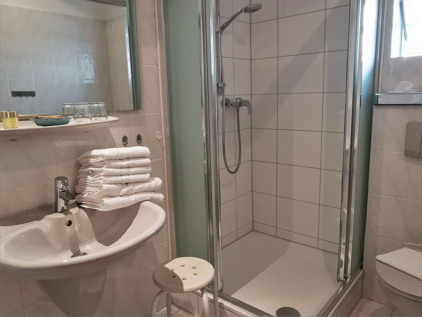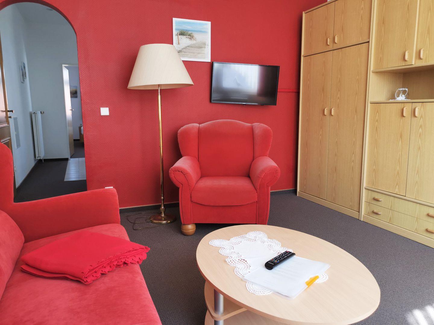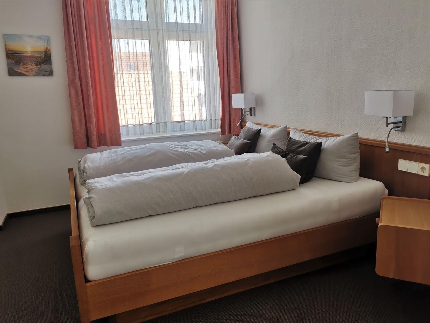 Helle, geräumige Wohnung im 1. Obergeschoss, ca. 58 qm, geeignet für 2 – 4 Personen. Die Wohnung besteht aus einem Wohn-Schlafraum mit Polsterecke und Schrank-Doppelbett sowie einem separatem Schlafzimmer mit Doppelbett. Das Badezimmer (Dusche/WC) ist von zwei Seiten unabhängig voneinander zugängig.