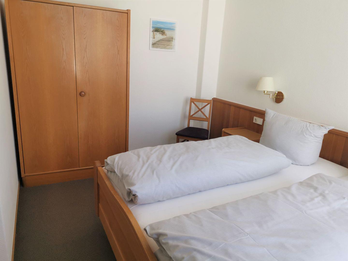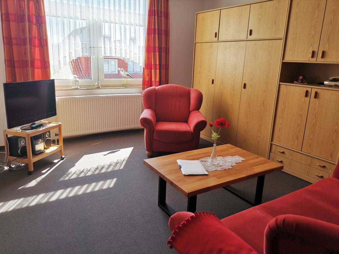 Helle, geräumige Wohnung im 1. Obergeschoss, ca. 58 qm, geeignet für 2 – 4 Personen. Die Wohnung besteht aus einem Wohn-Schlafraum mit Polsterecke und Schrank-Doppelbett sowie einem separatem Schlafzimmer mit Doppelbett.