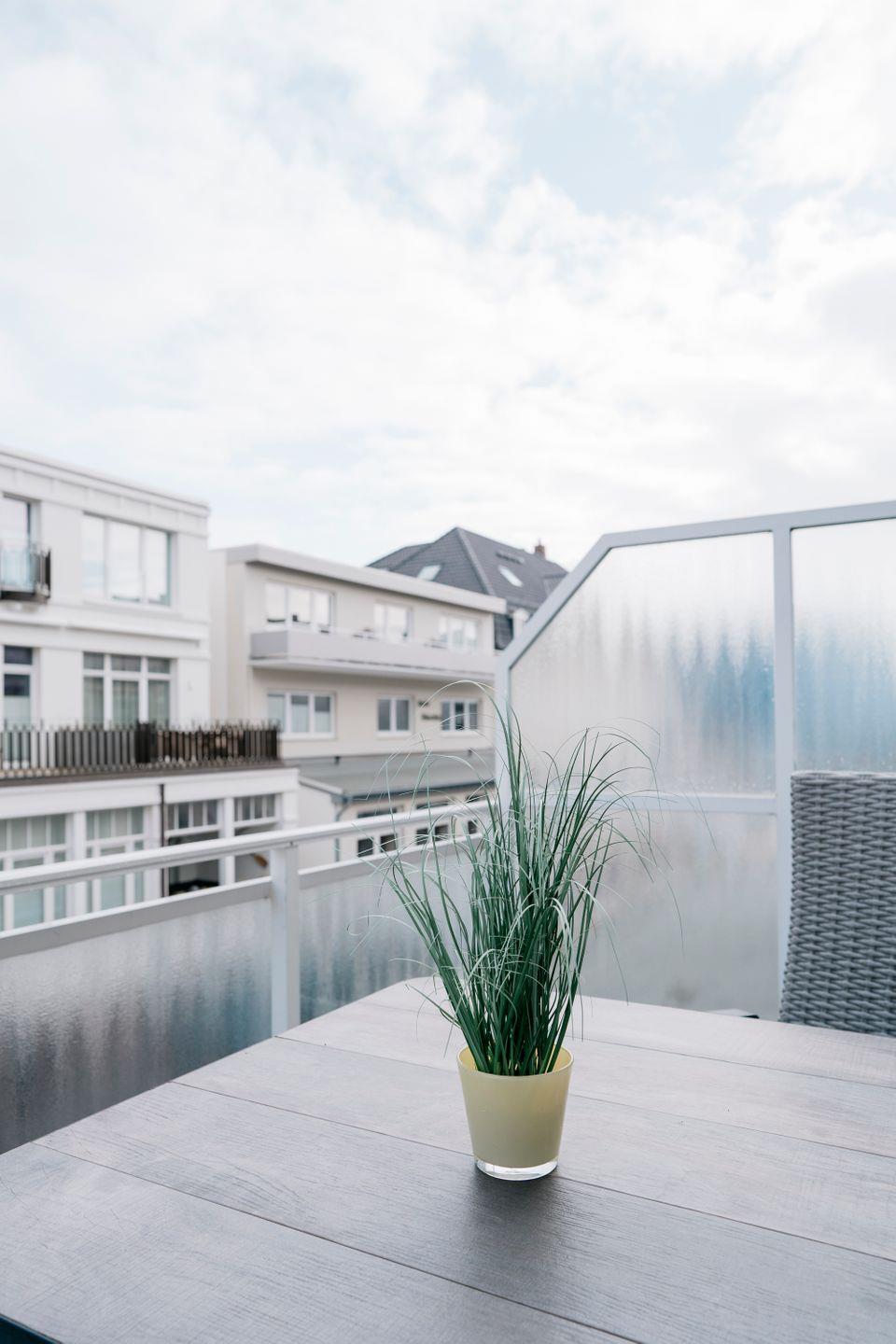 Ein besonderes Highlight ist der großzügige Balkon mit etwa 15?m², der mit schönen Gartenmöbeln zum Essen im Freien oder Sonnenbaden einlädt. Von hier genießen Sie einen seitlichen Meerblick und können entspannte Stunden an der frischen Luft verbringen.
