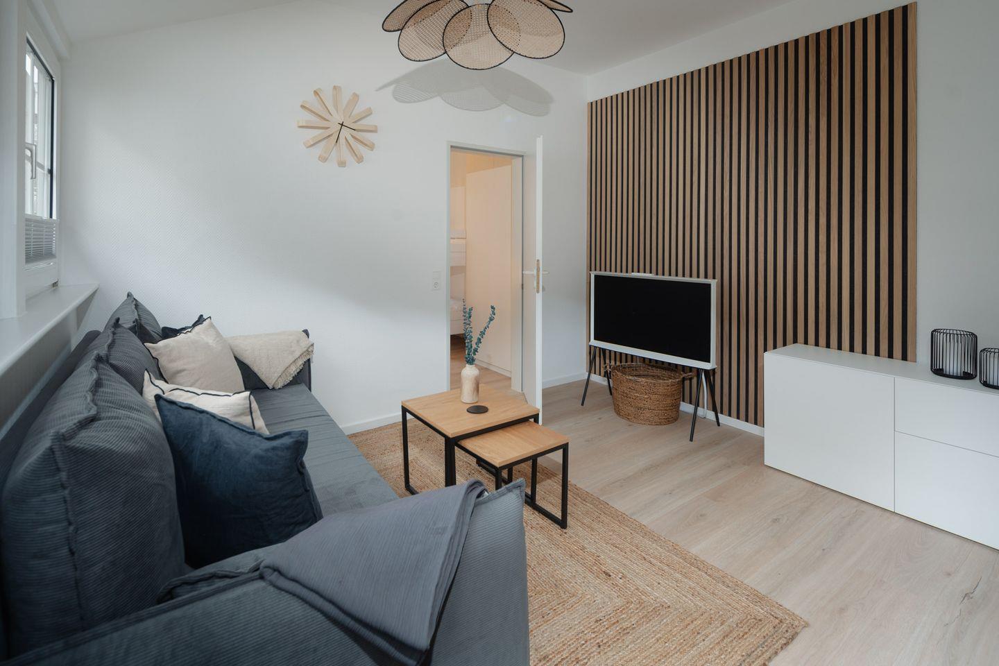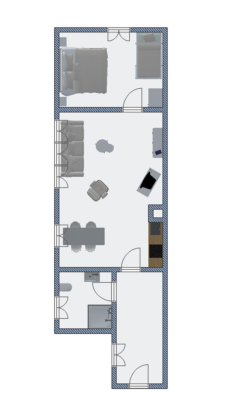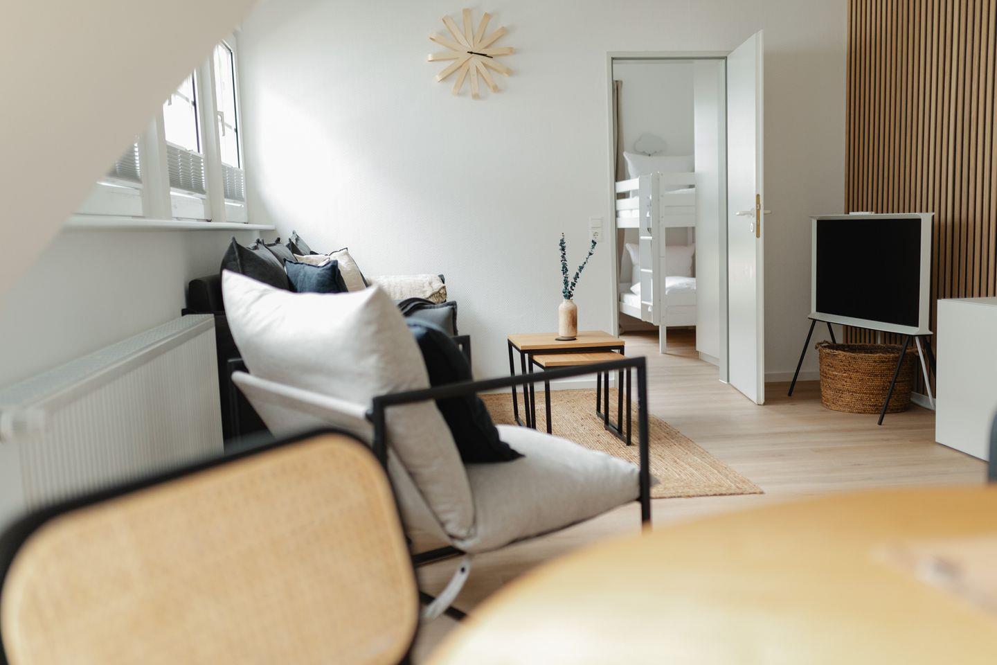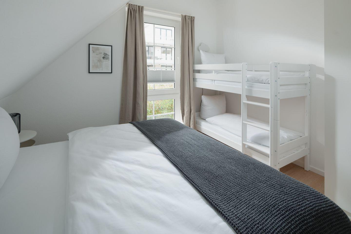 Die Wohnung ist komplett ausgestattet und bietet alles, was Sie für einen angenehmen Aufenthalt benötigen. Das Schlafzimmer verfügt über ein komfortables Boxspringbett der Größe 180x200cm sowie ein Hochbett der Größe von 70x160 cm (nur für Kinder geeignet!).