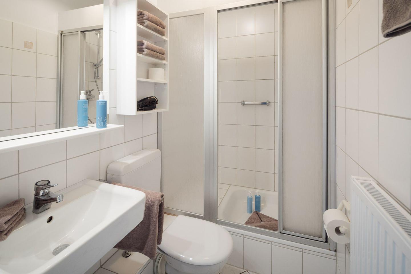 Das Badezimmer ist mit einem Waschbecken, einem WC sowie einer Dusche ausgestattet. Die seperate Küche ist umfassend ausgestattet mit Kühlschrank, Gefrierfach, Ceranfeld , Spülmaschine, Kaffeemaschine und einer Nespresso-Kapselmaschine.