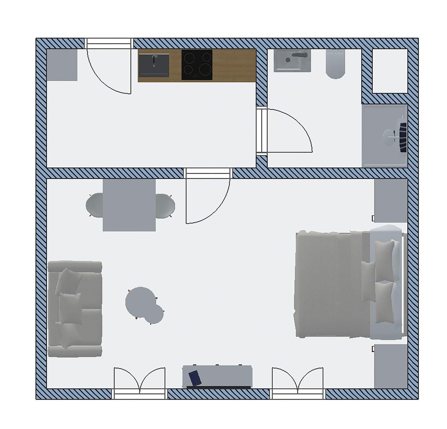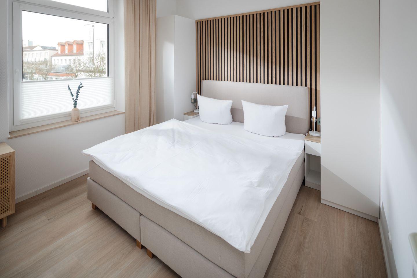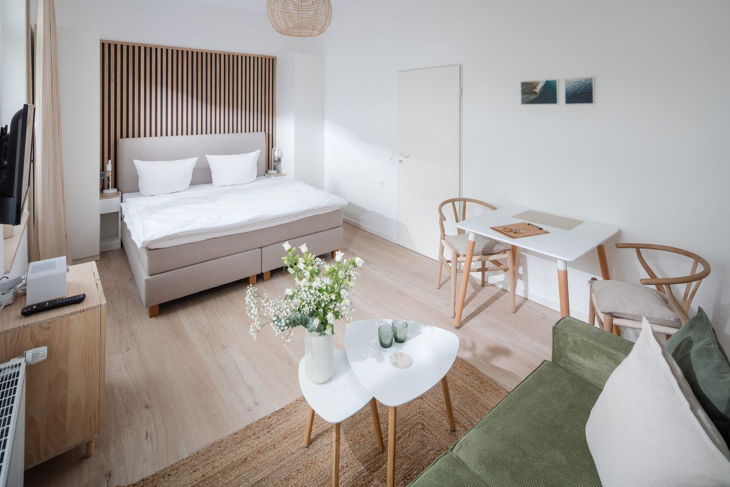 Das Appartment ist komplett ausgestattet und bietet alles, was Sie für einen angenehmen Aufenthalt benötigen. Für einen traumhaften Schlaf sorgt das Boxspringbett der Größe 180x200cm.