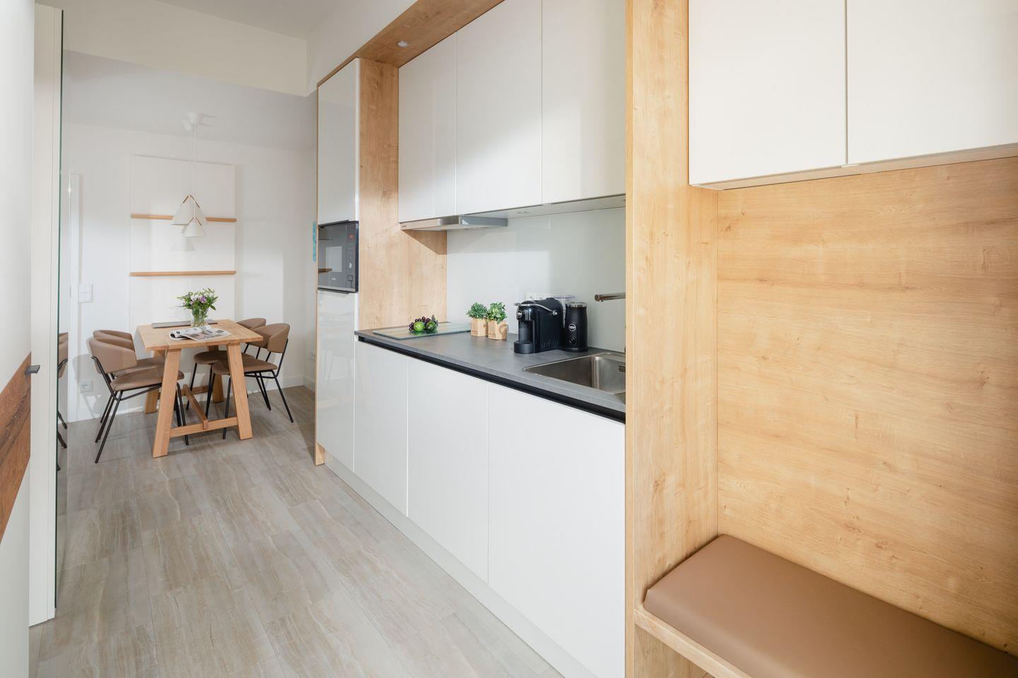 Erdgeschoss mit Wintergarten: Die Wohnung E6 liegt im Erdgeschoss (Achtung: nicht stufenlos erreichbar) und verfügt über einen Wintergarten mit Klimaanlage und Fußbodenheizung. Zur Ausstattung der Küche gehören unter anderem ein 2-Platten-Herd sowie eine Mikrowelle, ein Geschirrspüler, eine Filterkaffeemaschine und eine Kapselkaffeemaschine. Fahrräder der Hausgäste können im Innenhof abgestellt werden; Waschmaschine und Wäschetrockner stehen zur gemeinschaftlichen Nutzung im Untergeschoss bereit.