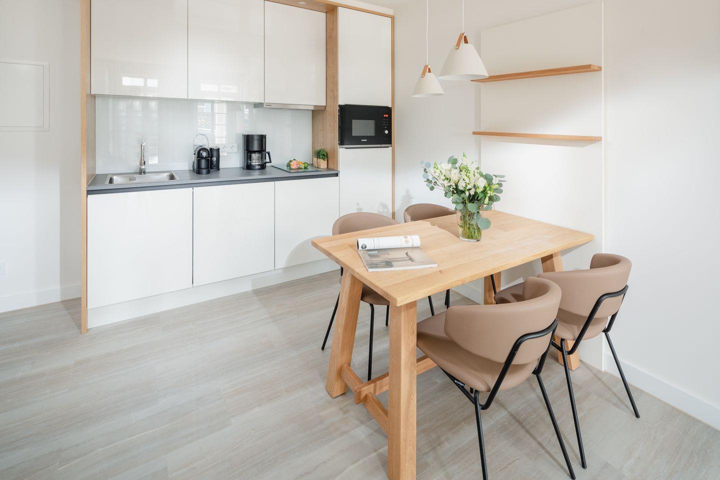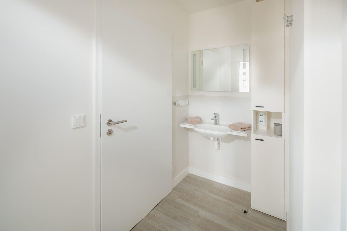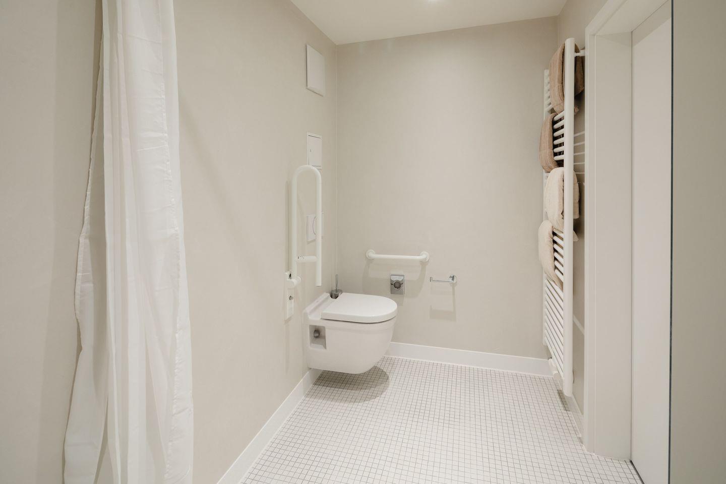 Souterrain barrierearm: Die Wohnung S5 liegt im Souterrain, ist ebenerdig zugänglich und durch die extrabreiten Türen für Rollstuhlfahrer sehr gut geeignet. Zur Ausstattung der Küche gehören unter anderem ein 2-Platten-Herd sowie eine Mikrowelle, ein Geschirrspüler, eine Filterkaffeemaschine und eine Kapselkaffeemaschine. Fahrräder der Hausgäste können im Innenhof abgestellt werden; Waschmaschine und Wäschetrockner stehen zur gemeinschaftlichen Nutzung im Untergeschoss bereit.