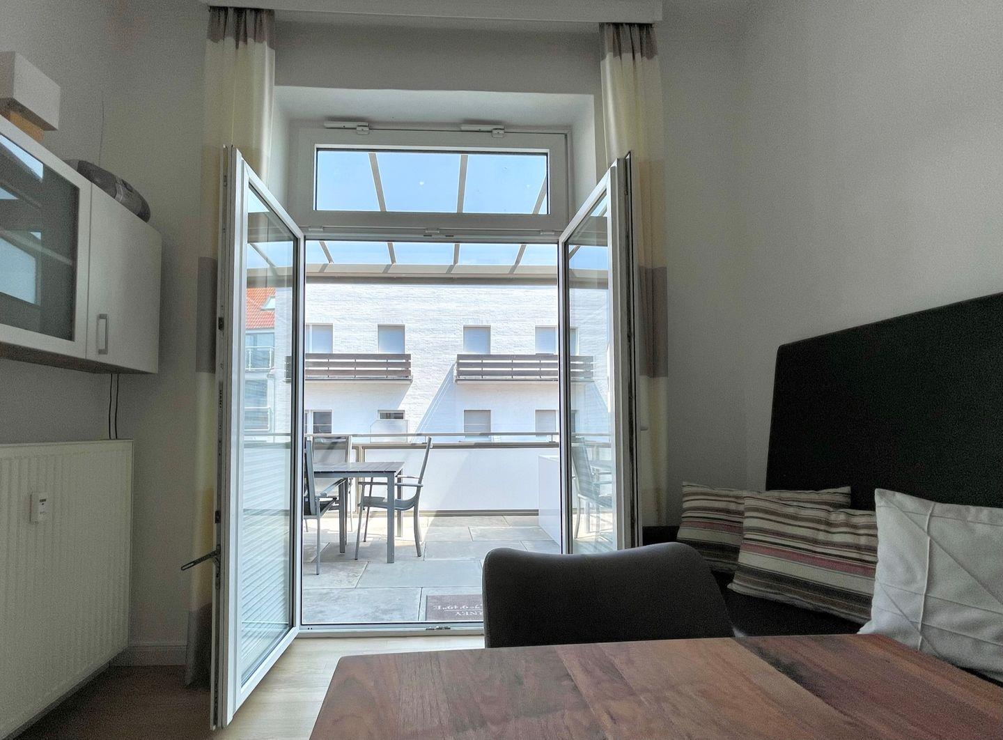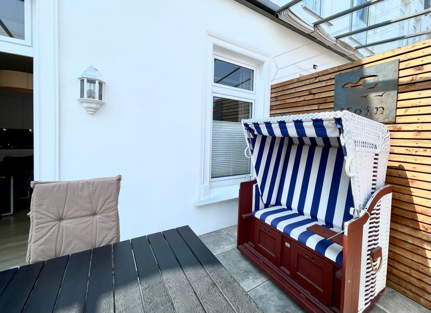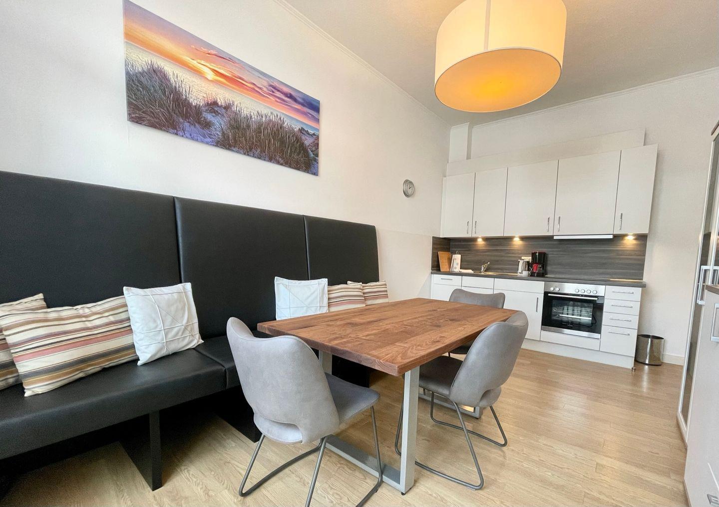 Der großzügige Wohn- und Essbereich mit integrierter Küchenzeile ist das Herzstück der Wohnung: Hier trifft stilvolles Ambiente auf praktische Ausstattung. Ob beim gemeinsamen Kochen, beim Frühstück oder beim geselligen Spiele- oder Fernsehabend – in dieser Wohnung werden Sie sich rundum wohlfühlen. Vom Wohnbereich aus betreten Sie den ca. 15 m² großen, komplett überdachten Balkon, der mit Gartenmöbeln und einem Strandkorb zum Verweilen an der frischen Nordseeluft einlädt.
