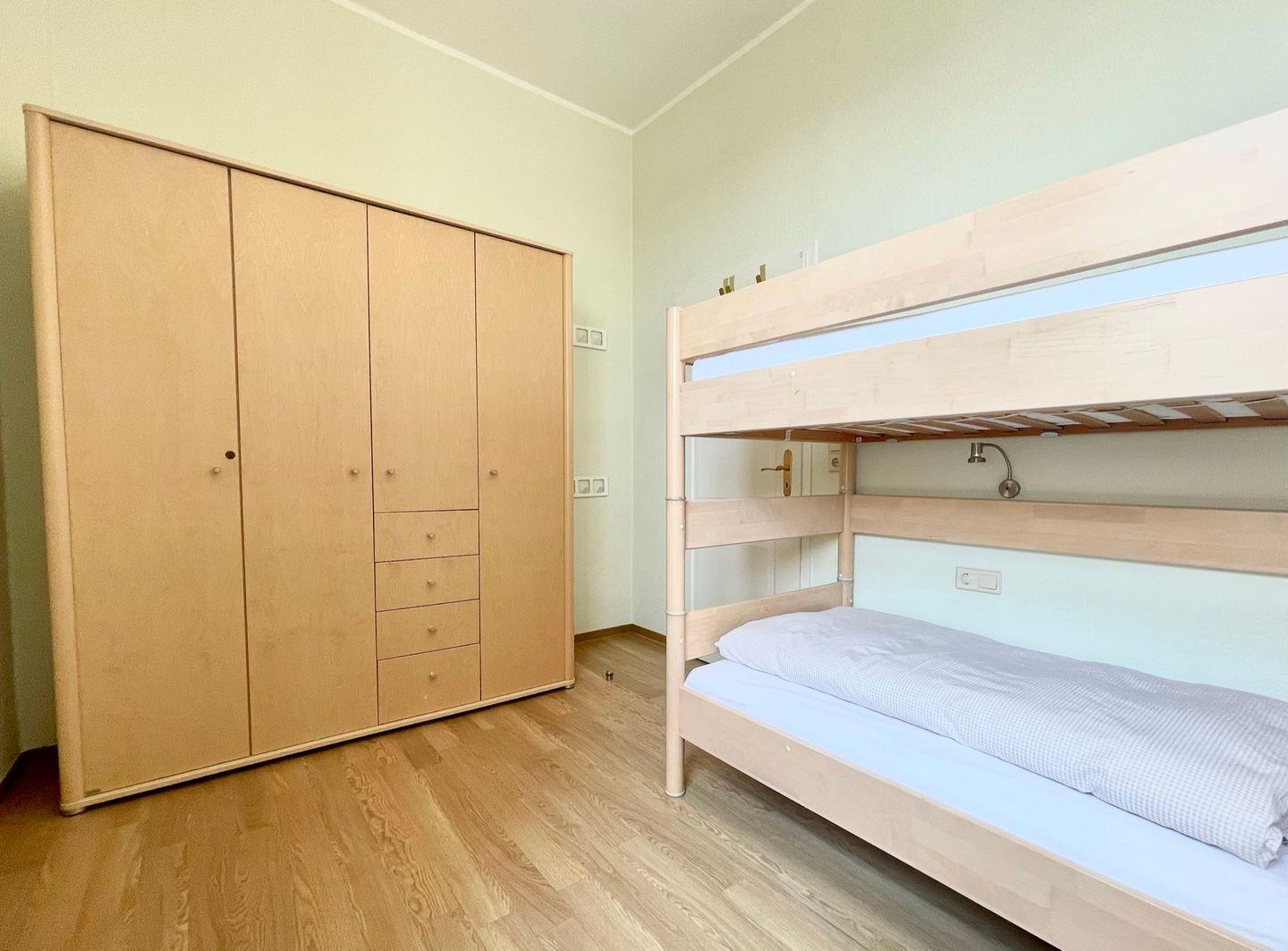 Das zweite Schlafzimmer bietet ein Etagenbett (90 x 200 cm), ein zusätzliches Einzelbett (90 x 200 cm) sowie einen geräumigen Kleiderschrank – perfekt für Kinder oder Freunde.