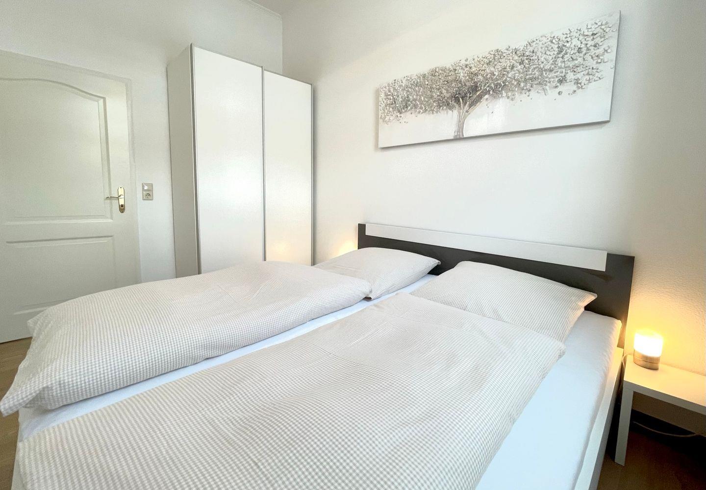 Das erste Schlafzimmer ist mit einem Doppelbett (180 x 200 cm), Kleiderschrank und einem eigenen Fernseher ausgestattet.