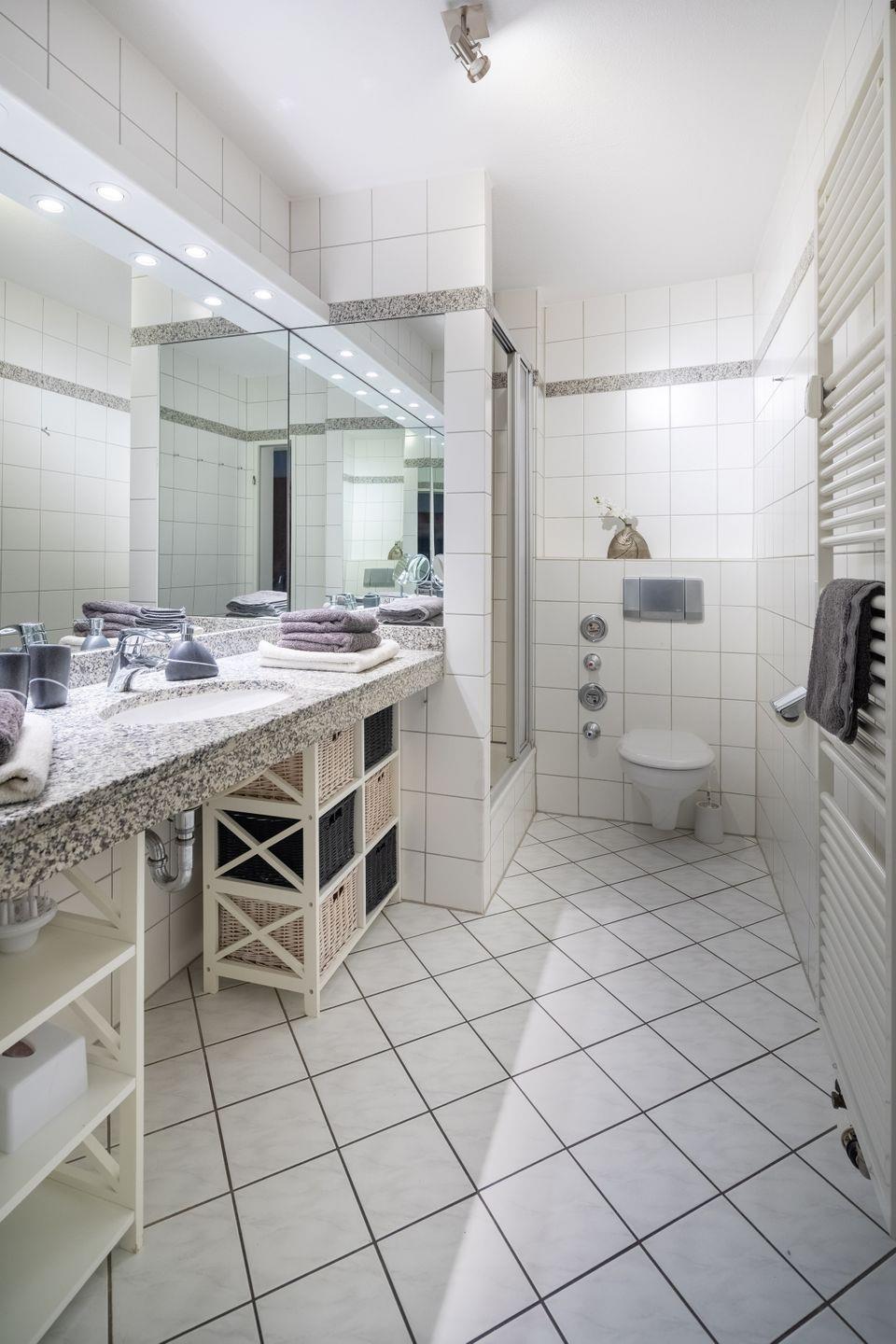 Das Badezimmer ist modern eingerichtet und verfügt über einen großen Waschtisch mit Ablage, Dusche, WC, Haartrockner und Handtuchtrockner.