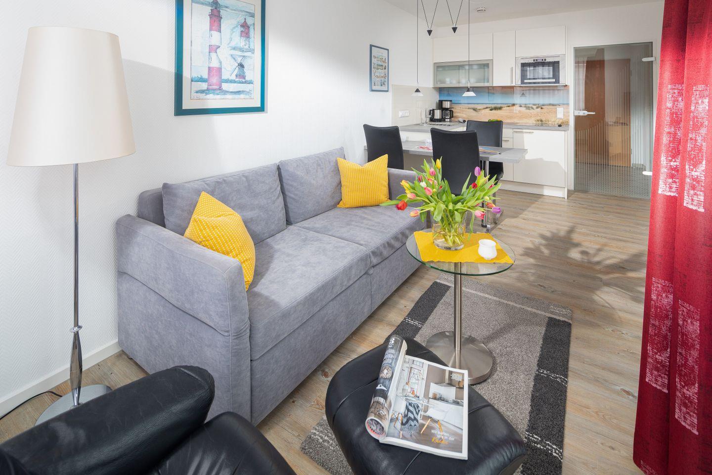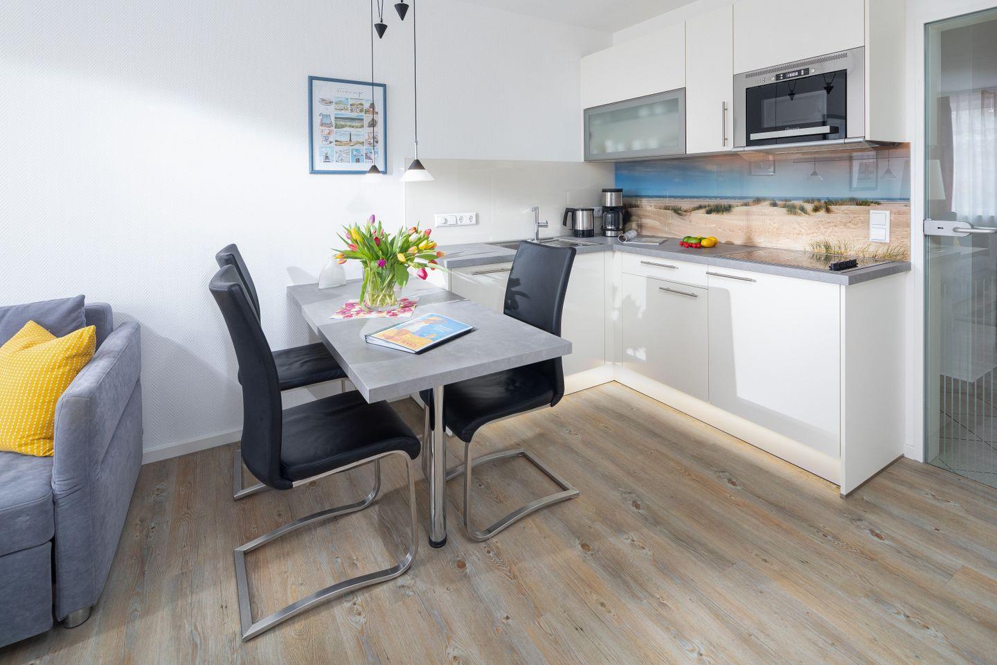 Die im Wohnzimmer integrierter Küchenzeile ist ausgestattet mit Geschirrspüler, Mikrowelle, Kühlschrank, Cerankochfeld sowie Toaster, Kaffeemaschine und einem Wasserkocher.