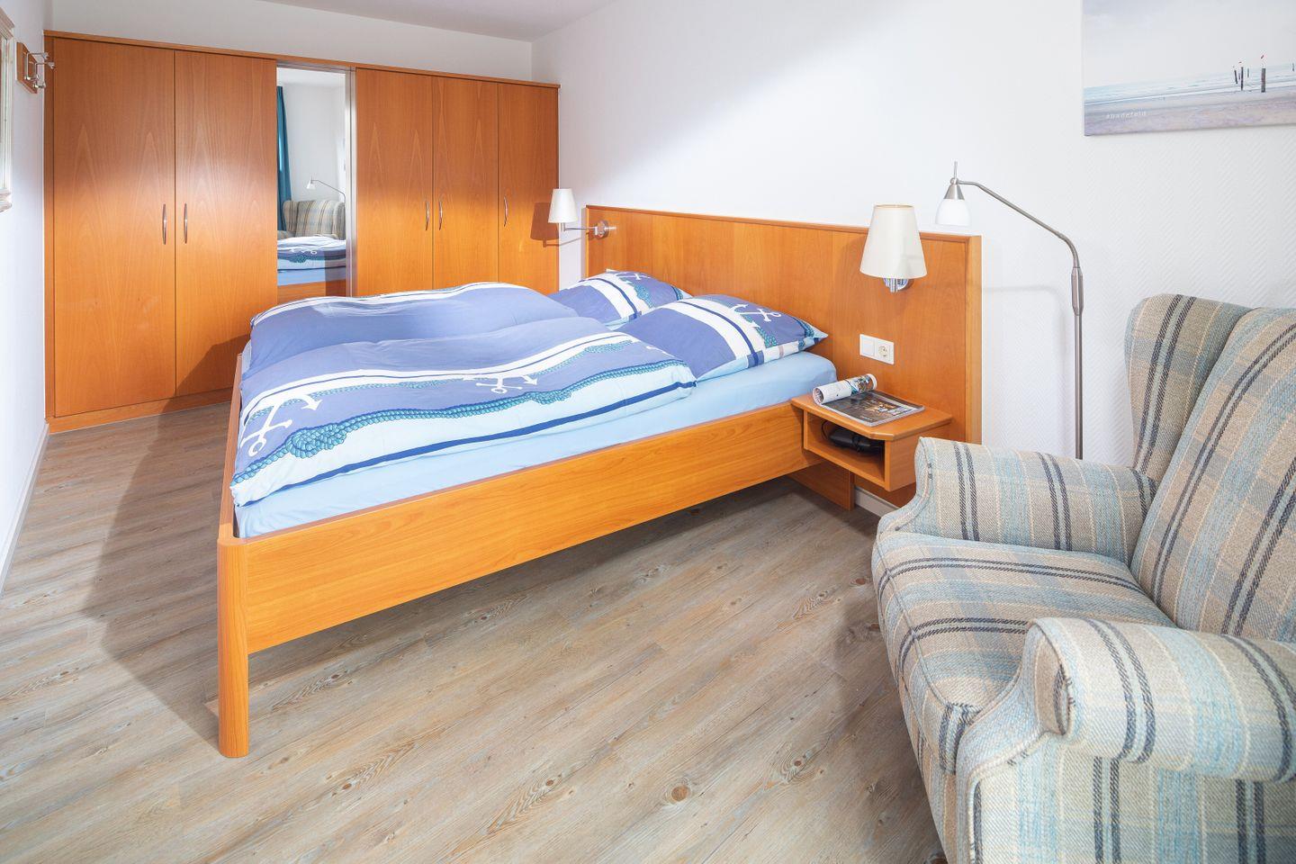 In dem separaten Schlafzimmer steht ein großes und bequemes Doppelbett, ein Sessel und ein großer Kleiderschrank mit Ganzkörperspiegel.