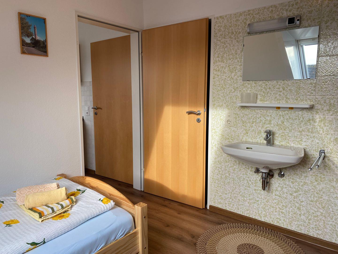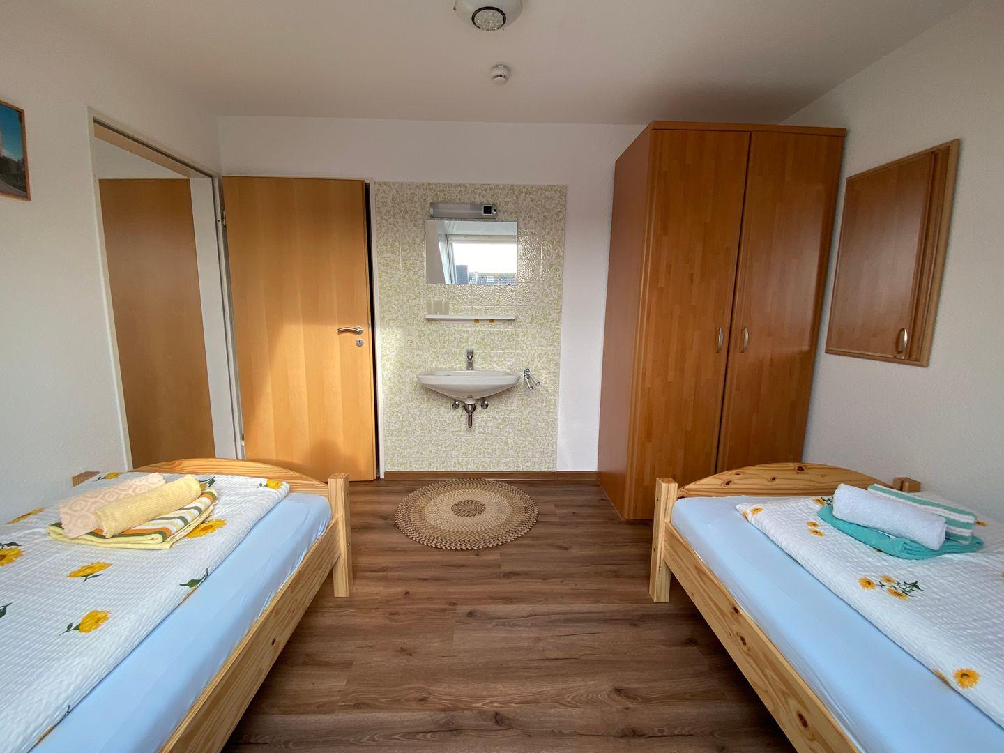 Das Schlafzimmer ist mit zwei Einzelbetten ausgestattet, freundlich gestaltet und sorgt für erholsame Nächte. Für die kleinsten Gäste steht zusätzlich ein Babybett sowie ein Hochstuhl auf Nachfrage bereit, sodass Familien mit Kleinkindern herzlich willkommen sind. Das Badezimmer bietet Ihnen mit einer Dusche die Möglichkeit, sich nach einem langen Strandtag entspannt zu erfrischen.