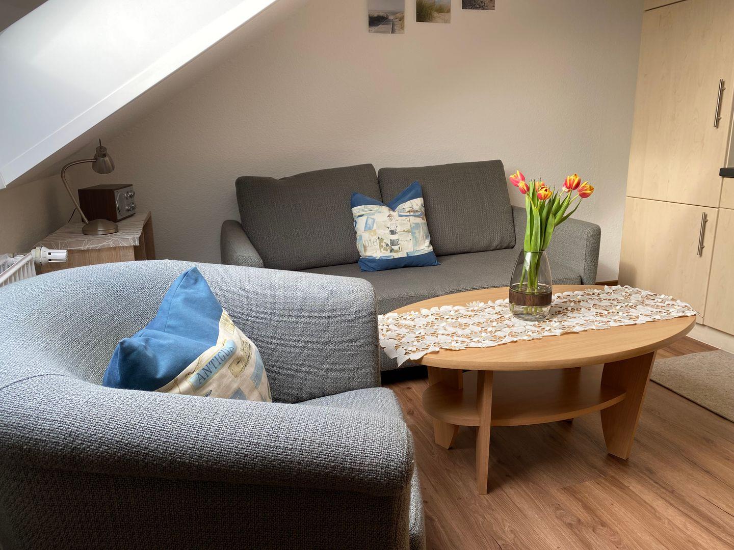 Die Wohnung verteilt sich auf eine Fläche von 30 m² im zweiten Stock eines gepflegten Hauses. Der Wohnbereich ist mit einem bequemen Sofa, einem Sessel und einem Fernseher ausgestattet, sodass Sie nach einem erlebnisreichen Tag auf der Insel entspannen können. Die offenen Wohnküche ist modern eingerichtet und bietet alles, was Sie für einen angenehmen Aufenthalt benötigen: einen Kühlschrank, einen Ceranherd, eine Kaffeemaschine und verschiedene Küchenutensilien. Gemeinsam am Esstisch genießen Sie Ihre selbst zubereiteten Gerichte in einem gemütlichen Ambiente.