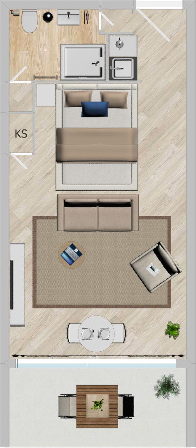 Der durchdachte Grundriss umfasst ein komfortables Doppelbett (180x200), eine gemütliche Sitzecke mit Sofa und Sessel sowie einen kleinen Esstisch mit zwei Stühlen. Vom Wohnbereich aus gelangt ihr direkt auf den möblierten Balkon mit Meerblick und optimaler Süd-/Südwest-Ausrichtung – hier könnt ihr nahezu den ganzen Tag die Sonne genießen, vom ersten Kaffee am Morgen bis zum entspannten Ausklang am Abend.