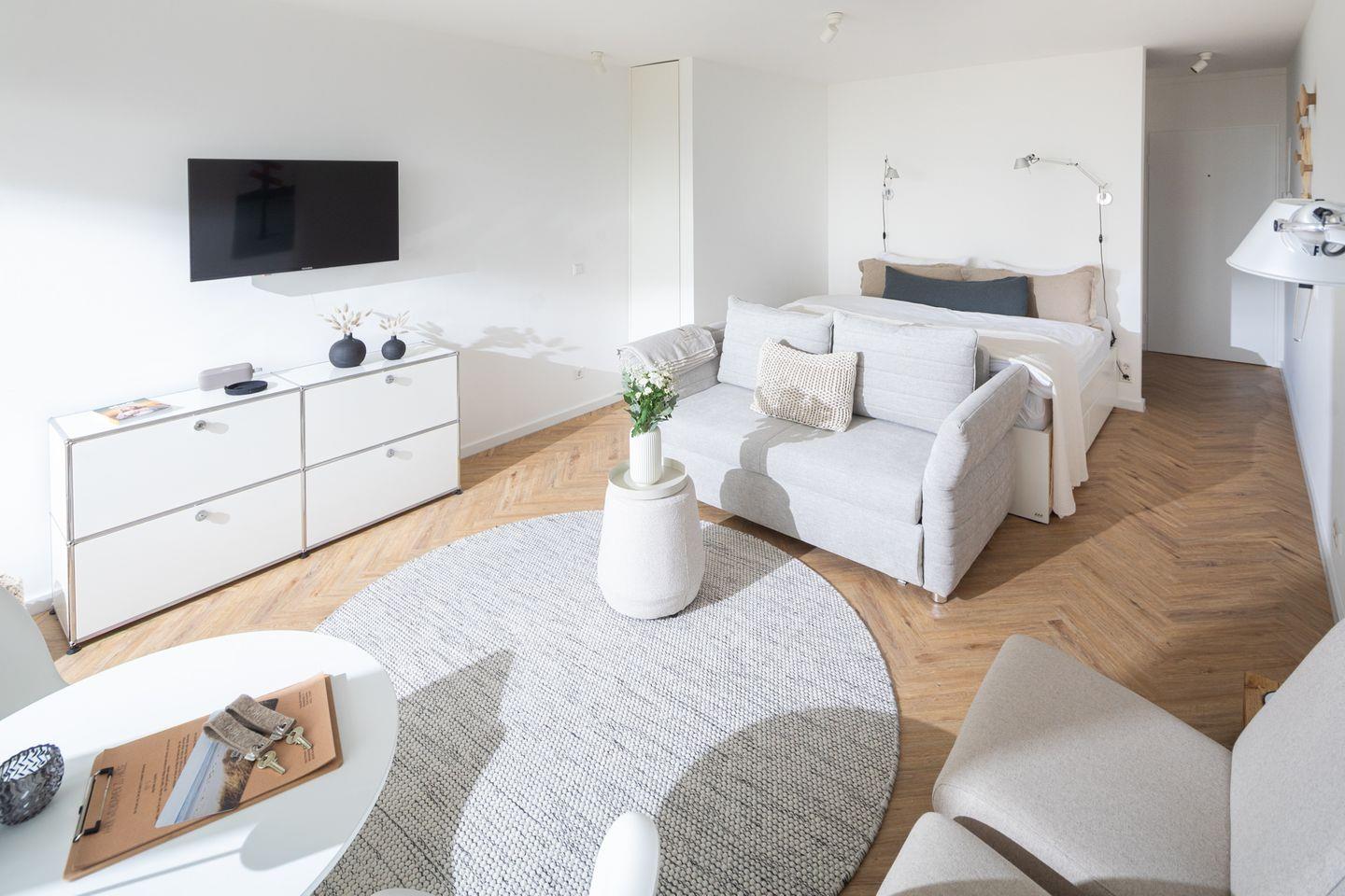 Hochwertig sanierte Einraumwohnung – ideal für 2 Personen (+ Hund). Designklassiker, Smart-TV, moderne Küchenzeile mit Nespresso & Mikrowelle (Grill), begehbare Dusche. Balkon mit Süd/Südwest-Ausrichtung & Meerblick. Toplage nahe Weststrand, Innenstadt & Milchbar. Fahrradabstellplatz & Gepäckkeller inklusive.