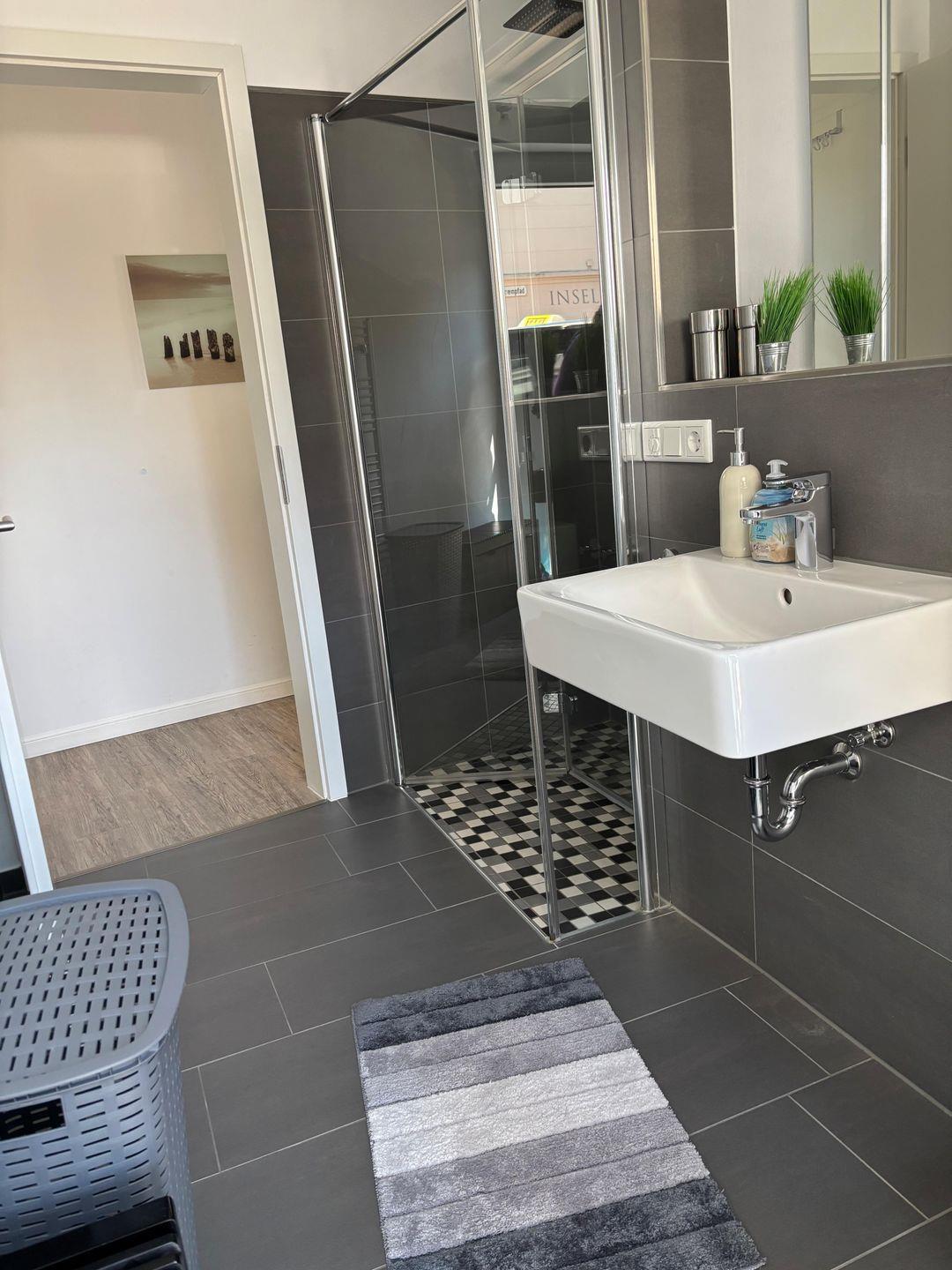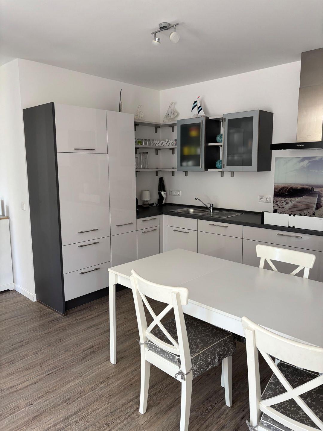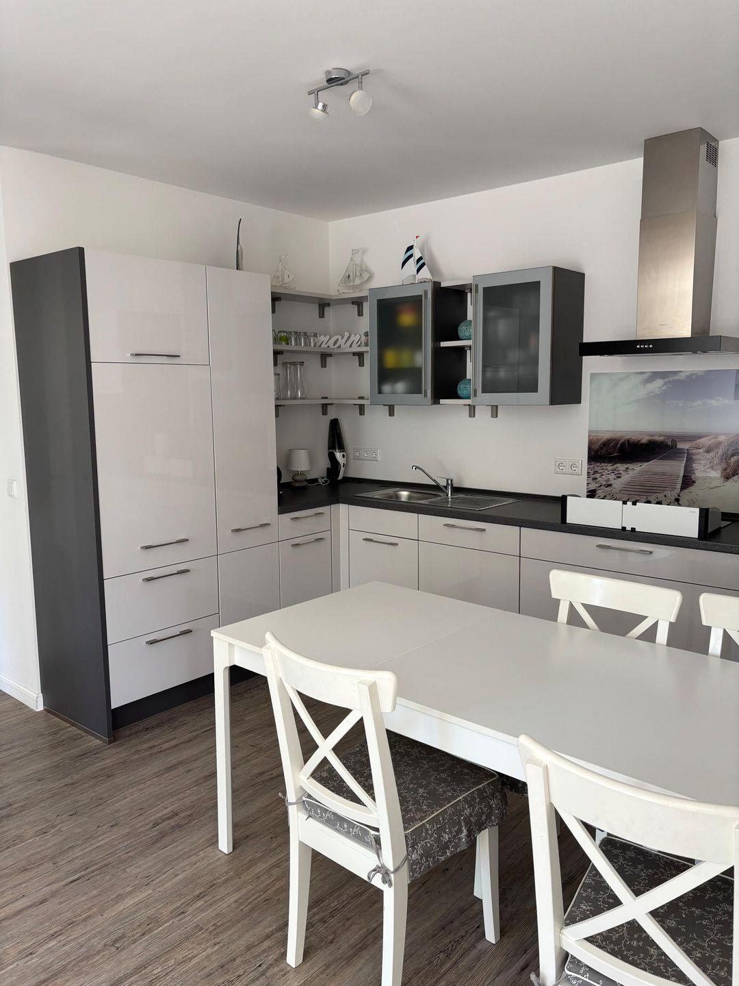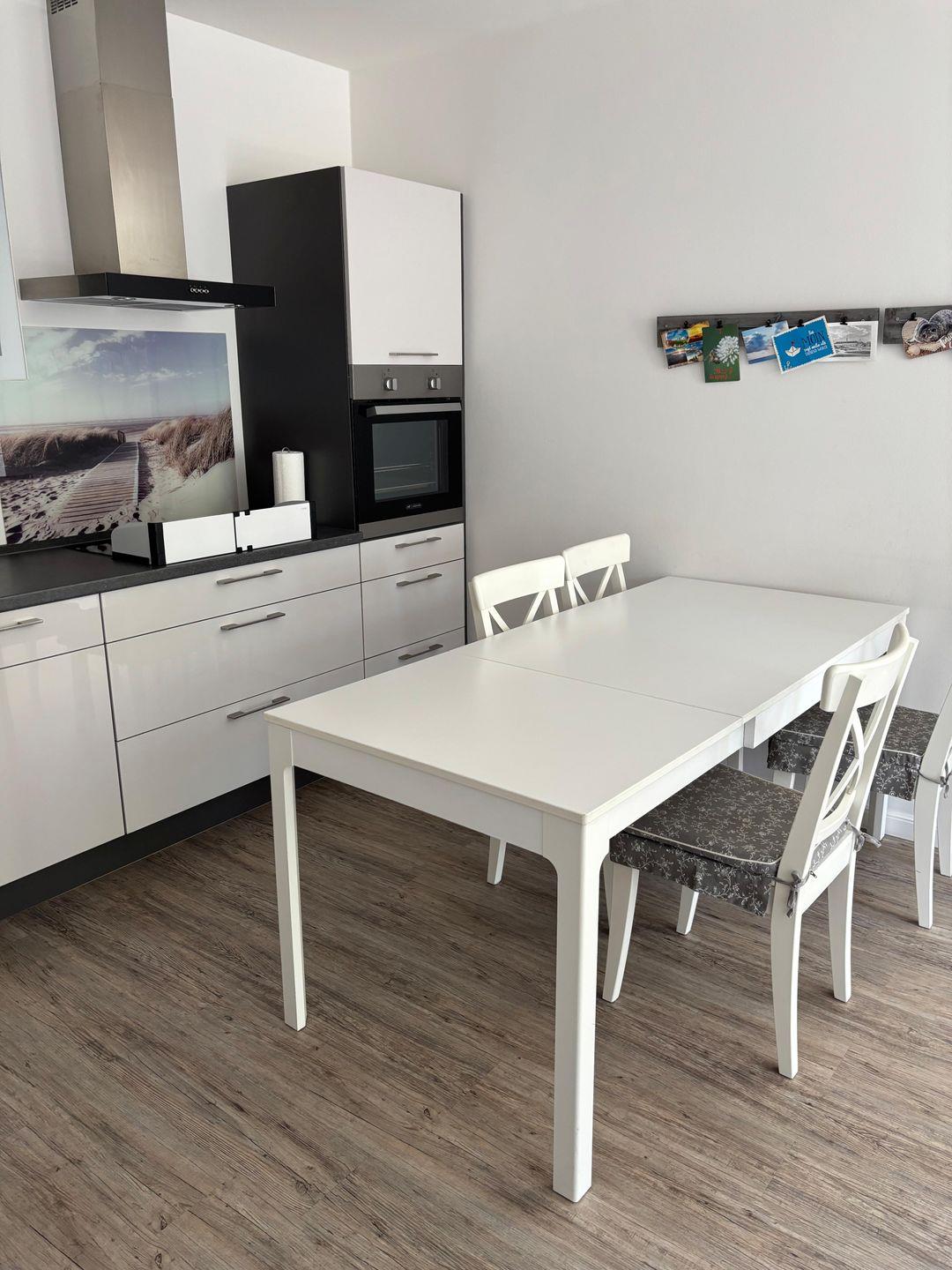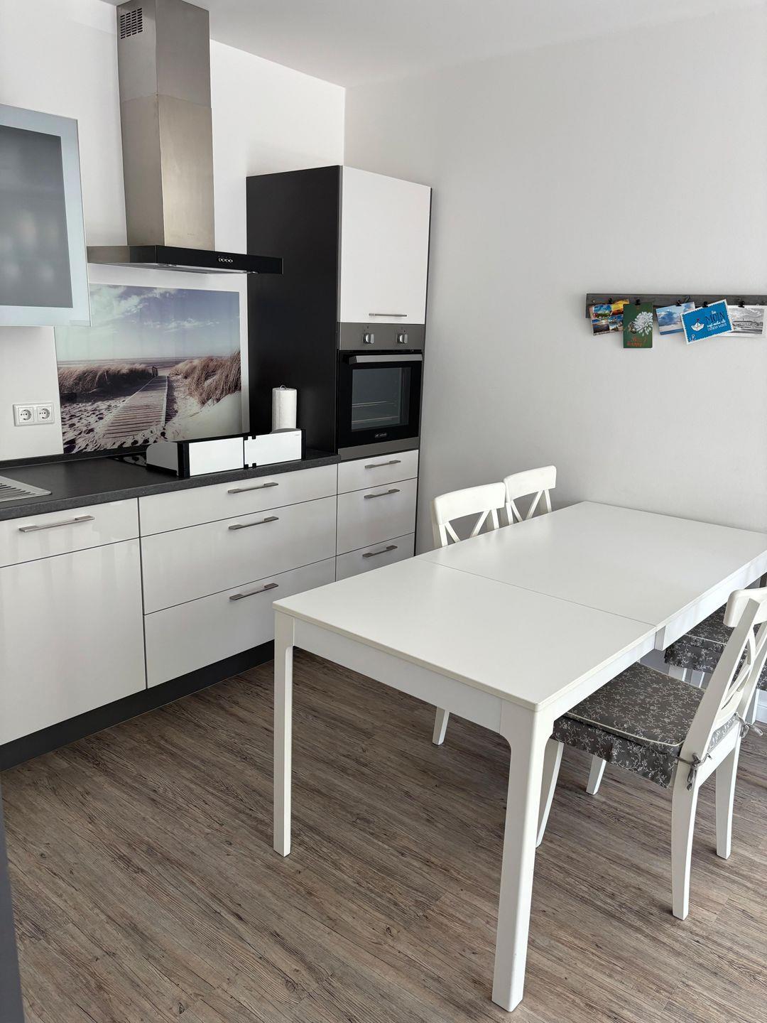 Die moderne Einbauküche ist voll ausgestattet und hat hochwertige Küchengeräte. Zur Ausstattung gehören ein Geschirrspüler, Kühlschrank mit Eisfach, Backofen, Induktionsherd mit vier Kochfeldern, Dunstabzugshaube, hochwertige Kochgeschirr und Ess- und Kaffeegeschirr. Eine Filter-Kaffeemaschine, Toaster und Wasserkocher sind ebenfalls vorhanden. Der Esstisch bietet Platz für bis zu 4 Personen.