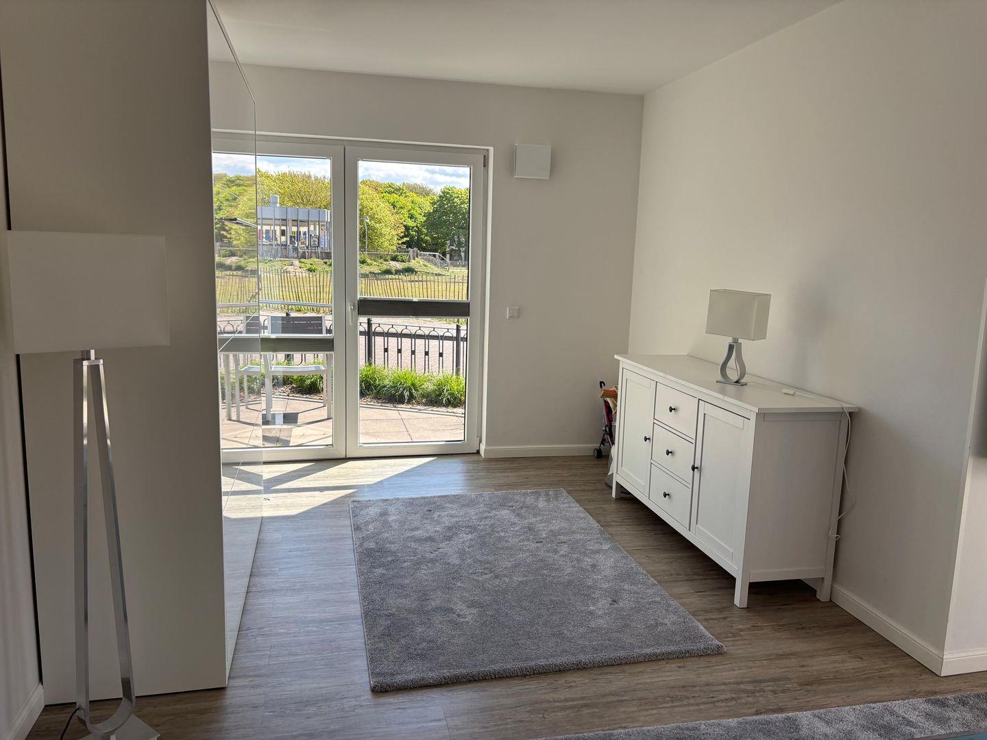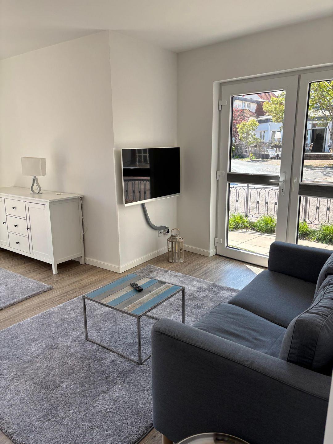 Das Wohnzimmer ist durch die bodentiefen Fenster besonders hell und lichtdurchflutet. Von hier aus hat man einen direkten Zugang zur Terrasse und zum Garten. Im Wohnzimmer befindet sich ein modernes Schrankbett und bietet eine zusätzliche Schlafmöglichkeit für 1 - 2 Personen. WLAN steht Ihnen kostenlos zur Verfügung.