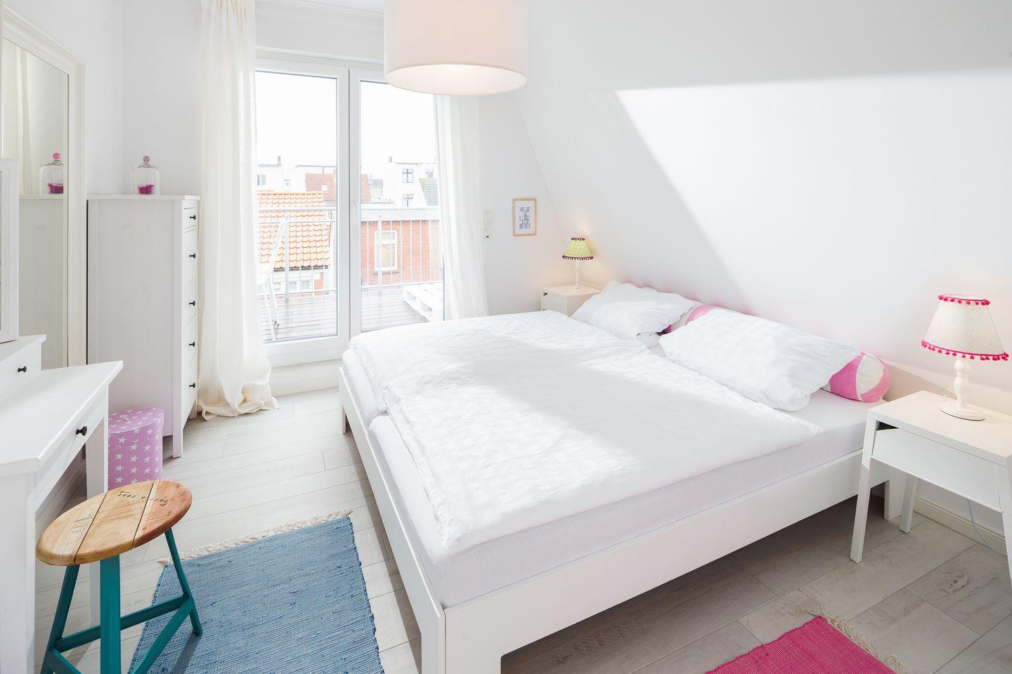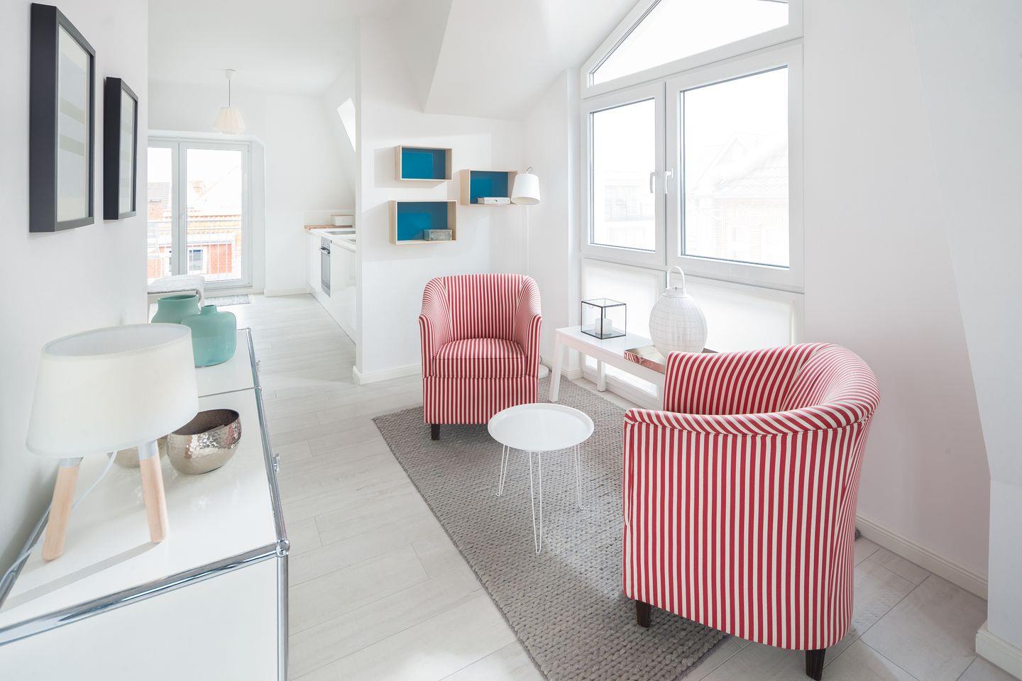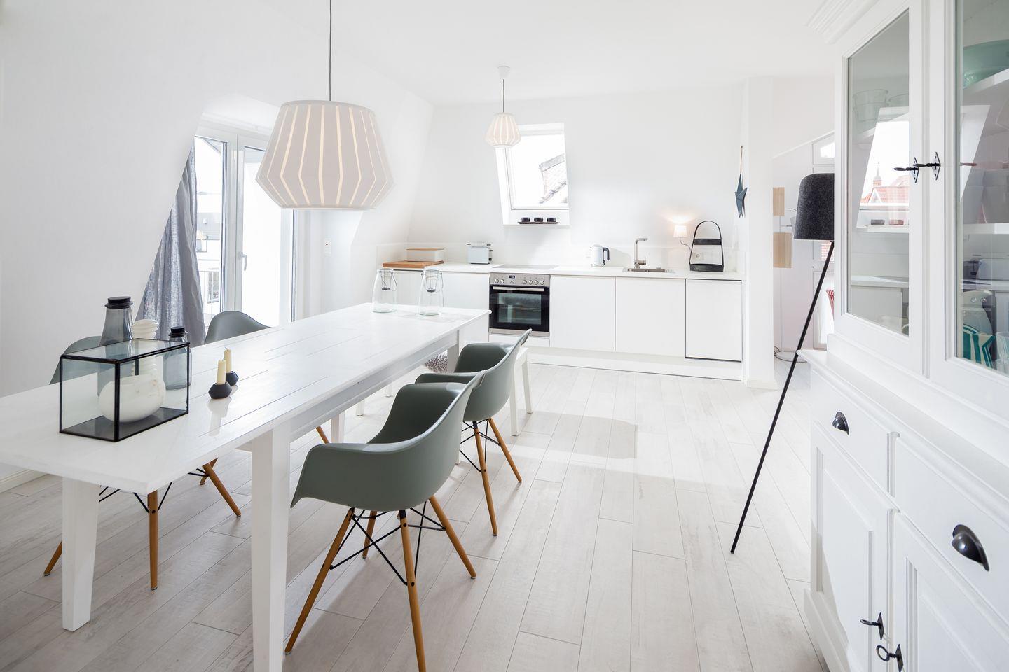 Dieses helle und stilvolle Apartment erstreckt sich über das gesamte Dachgeschoss (2. Etage) und überzeugt durch seine zentrale Lage und eine hochwertige Ausstattung. Der großzügige, offene Wohnbereich mit TV lädt zum Entspannen ein. Angrenzend befindet sich die moderne, voll ausgestattete Küche mit gemütlichem Essbereich. Zwei separate Schlafzimmer, jeweils mit komfortablen Doppelbetten, sorgen für erholsamen Schlaf. Das elegante Badezimmer ist mit Dusche und WC ausgestattet. Besonderes Highlight: Drei Balkone bieten Sonnengenuss zu jeder Tageszeit – ideal für Frühstück im Freien, Sonnenbaden oder ein Glas Wein am Abend. Nichtraucherwohnung! Kein WLAN.