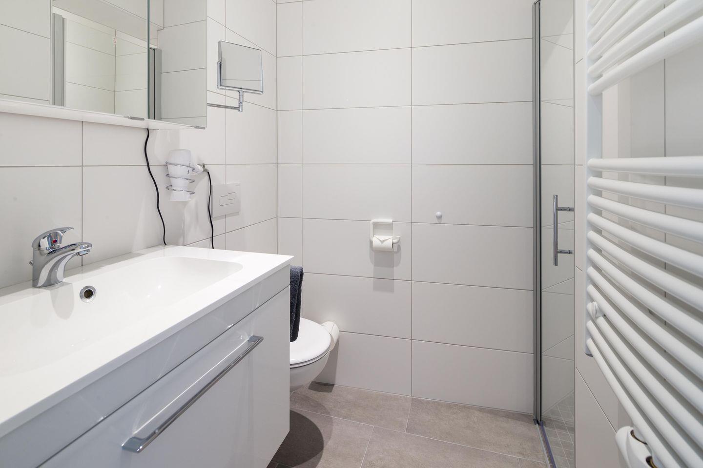 Ein paar Stufen führen nach unten, wo das separate Schlafzimmer mit großzügigem Boxspringbett wartet – ruhig, hell und ideal für erholsame Nächte. Das Duschbad ist modern und freundlich gestaltet, mit ebenerdiger Dusche, Waschtisch, großem Vergrößerungsspiegel und WC – eine stilvolle und funktionale Rückzugsoase.
