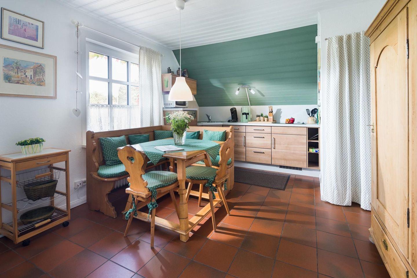 Die Wohnung selbst ist rustikal und gemütlich eingerichtet. Sie verfügt über ein Schlafzimmer mit Doppelbett, ein Wohnzimmer mit integrierter Küchenzeile und einen Essbereich. Das Badezimmer ist mit einer Dusche und WC ausgestattet. Hier darf auch der vierbeinige Freund mitkommen, denn die Ferienwohnung heißt auch Hunde herzlich willkommen. Erlaubt ist maximal 1 Hund (Höhe maximal kniehoch). Die Hundewiese befindet sich in der Nähe des Fährhafens (kein Leinenzwang).
