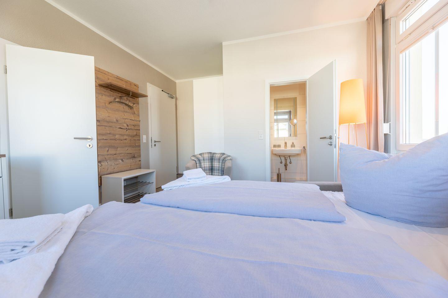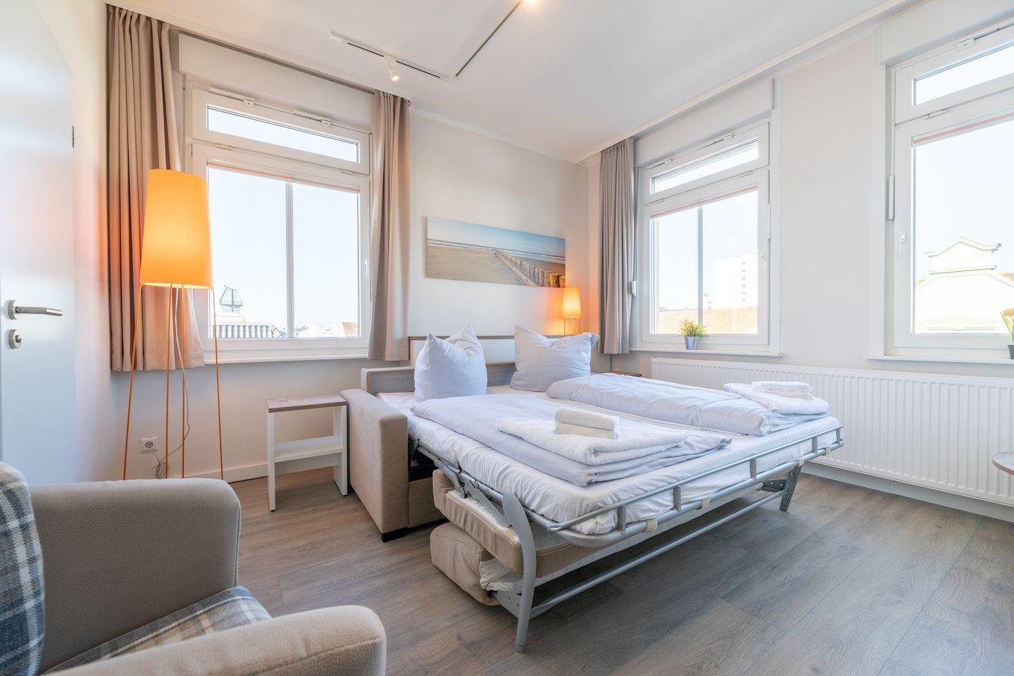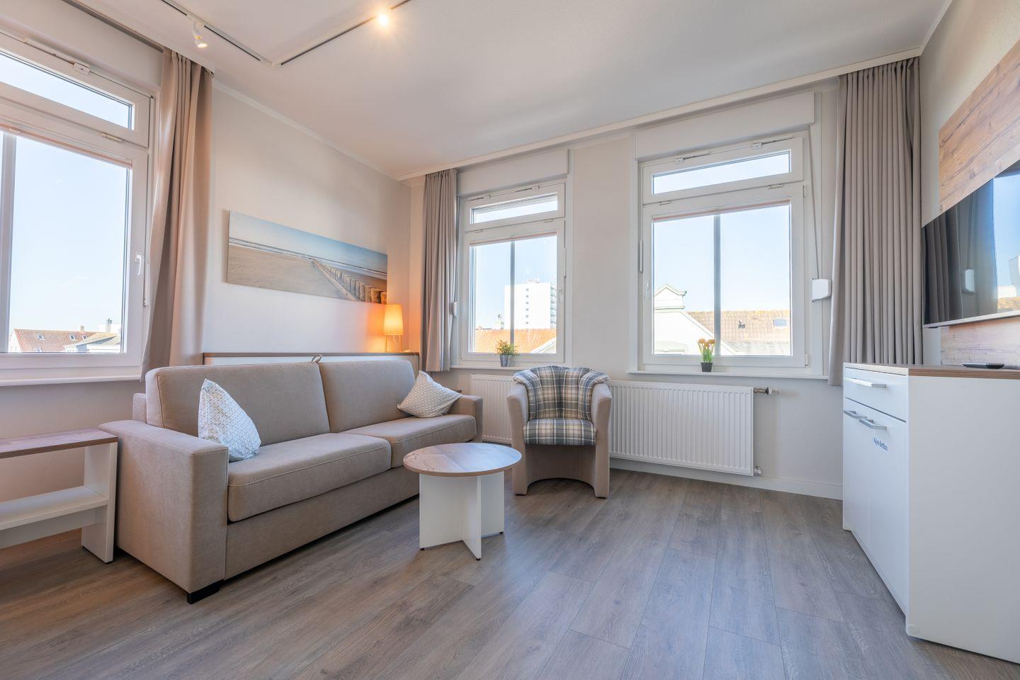 Kajüte 2 im Ferienhaus Inselanker präsentiert sich im neuen, maritimen Stil – modern, hell und einladend. Die Einraumwohnung auf 28 m² im 2. Obergeschoss (Deck 3) bietet Platz für bis zu 2 Personen und ist ideal für Singles oder Paare. Mit gemütlicher Sitzecke, ausziehbarem Schlafsofa, separater gut ausgestatteter Küche und modernem Badezimmer ist sie perfekt für einen entspannten Urlaub mit Sonne, Strand und echtem Norderneyer Urlaubsgefühl.