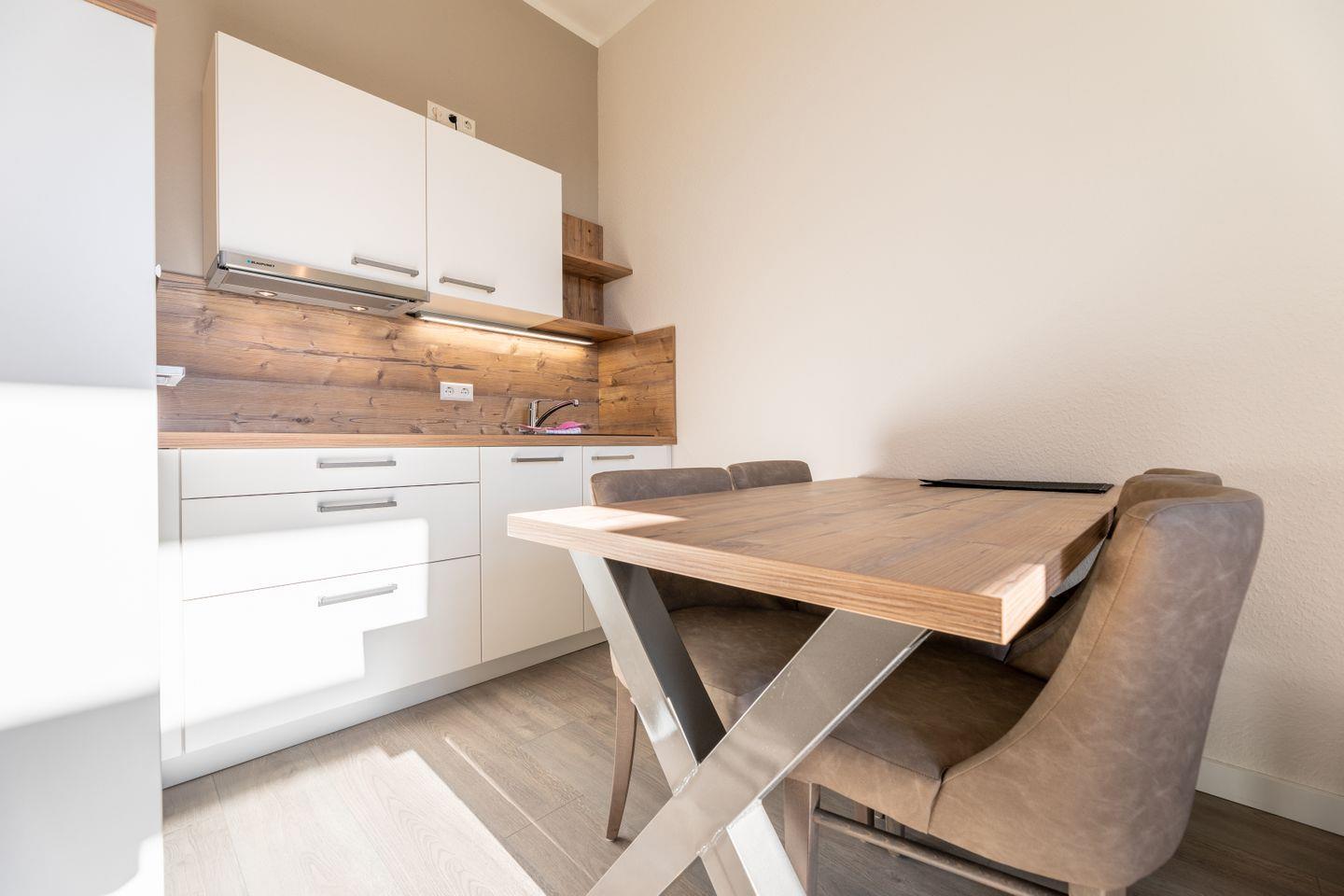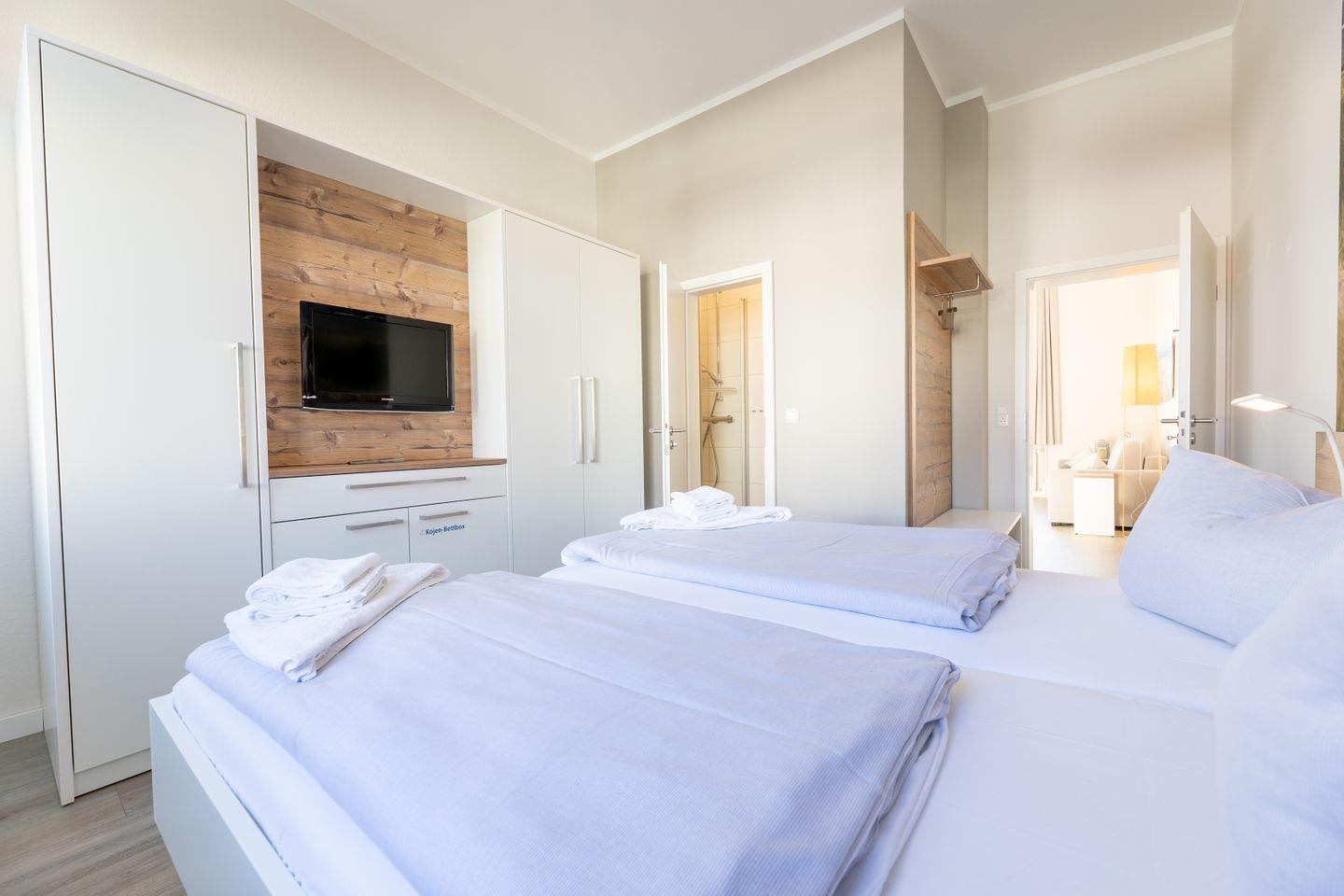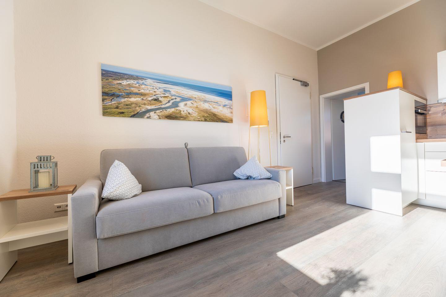 Kajüte 6 im Ferienhaus Inselanker erstrahlt im modernen maritimen Stil – hell, freundlich und gemütlich. Die Zweiraumwohnung auf 38 m² im 1. Obergeschoss (Deck 2) bietet Platz für bis zu 4 Personen und ist ideal für Familien mit Kind oder Baby. Der Wohnbereich mit Couch, Sessel und TV lädt zum Entspannen ein, die gut ausgestattete Küchenzeile mit Essplatz sorgt für gemeinsame Mahlzeiten. Im separaten Schlafzimmer sorgen Doppelbett und auf Wunsch ein Babybett für erholsame Nächte, die Schlafcouch bietet zusätzliche Schlafmöglichkeiten. Das Bad mit Dusche rundet den Komfort ab – perfekt für einen entspannten Norderney-Urlaub mit Sonne, Strand und Meeresluft.