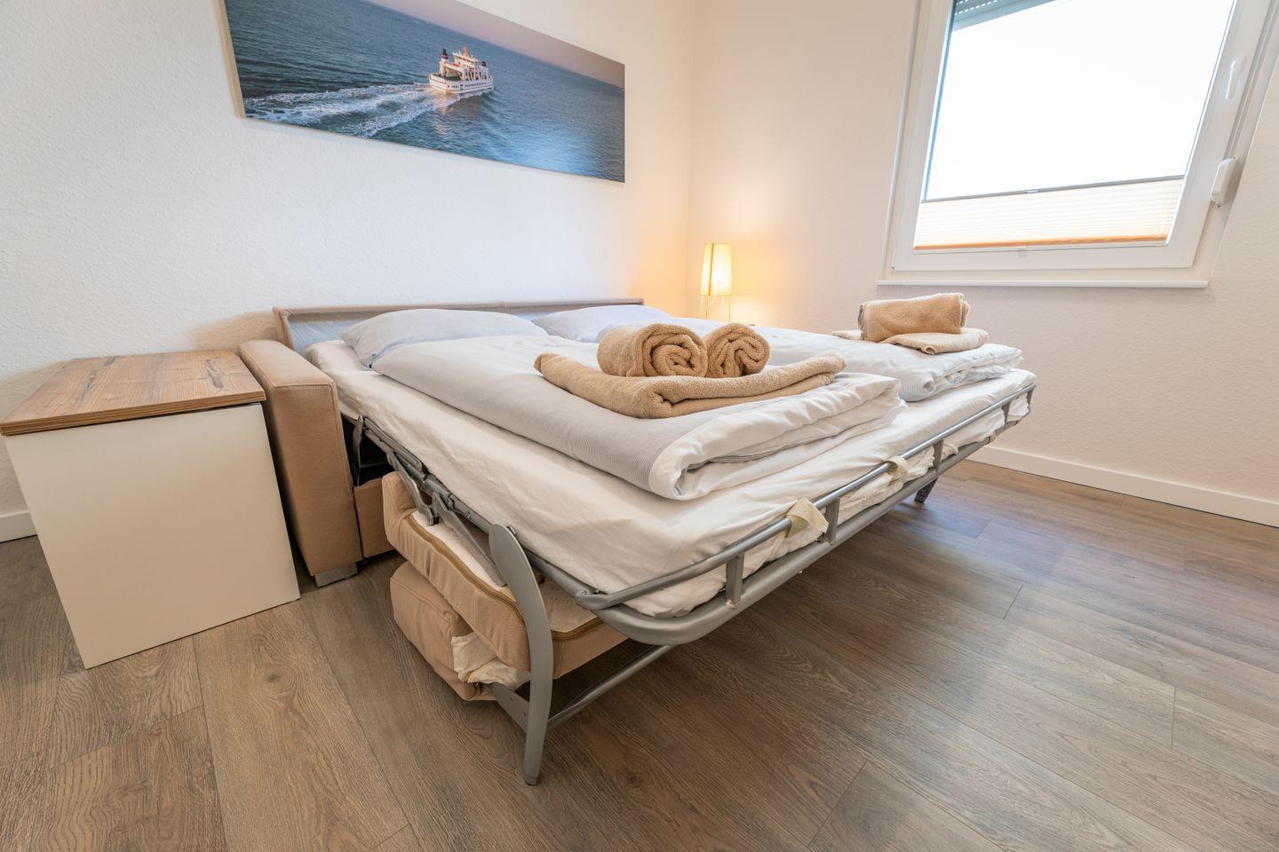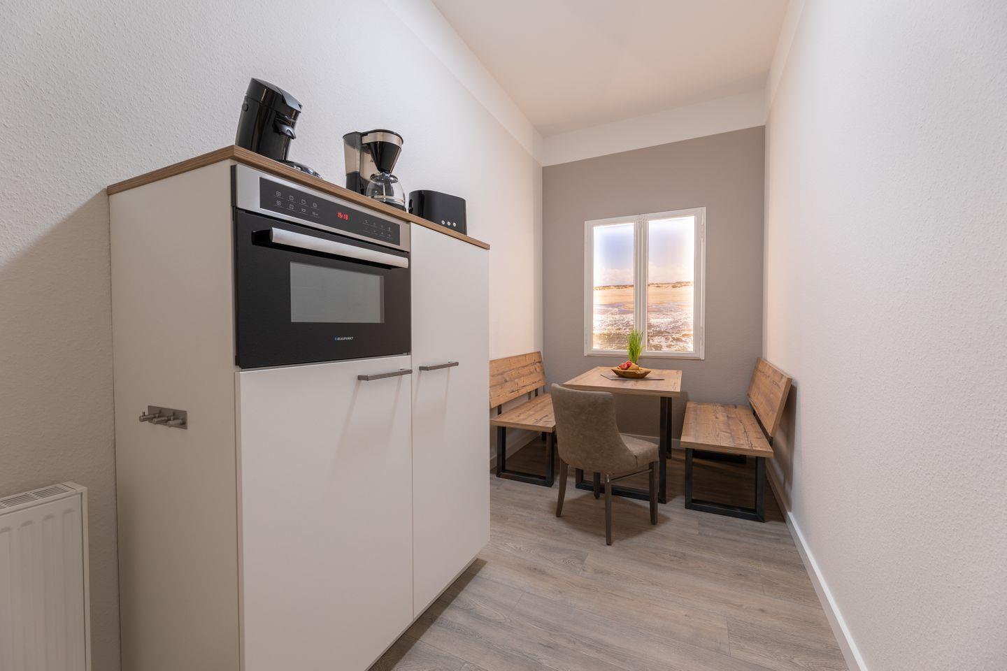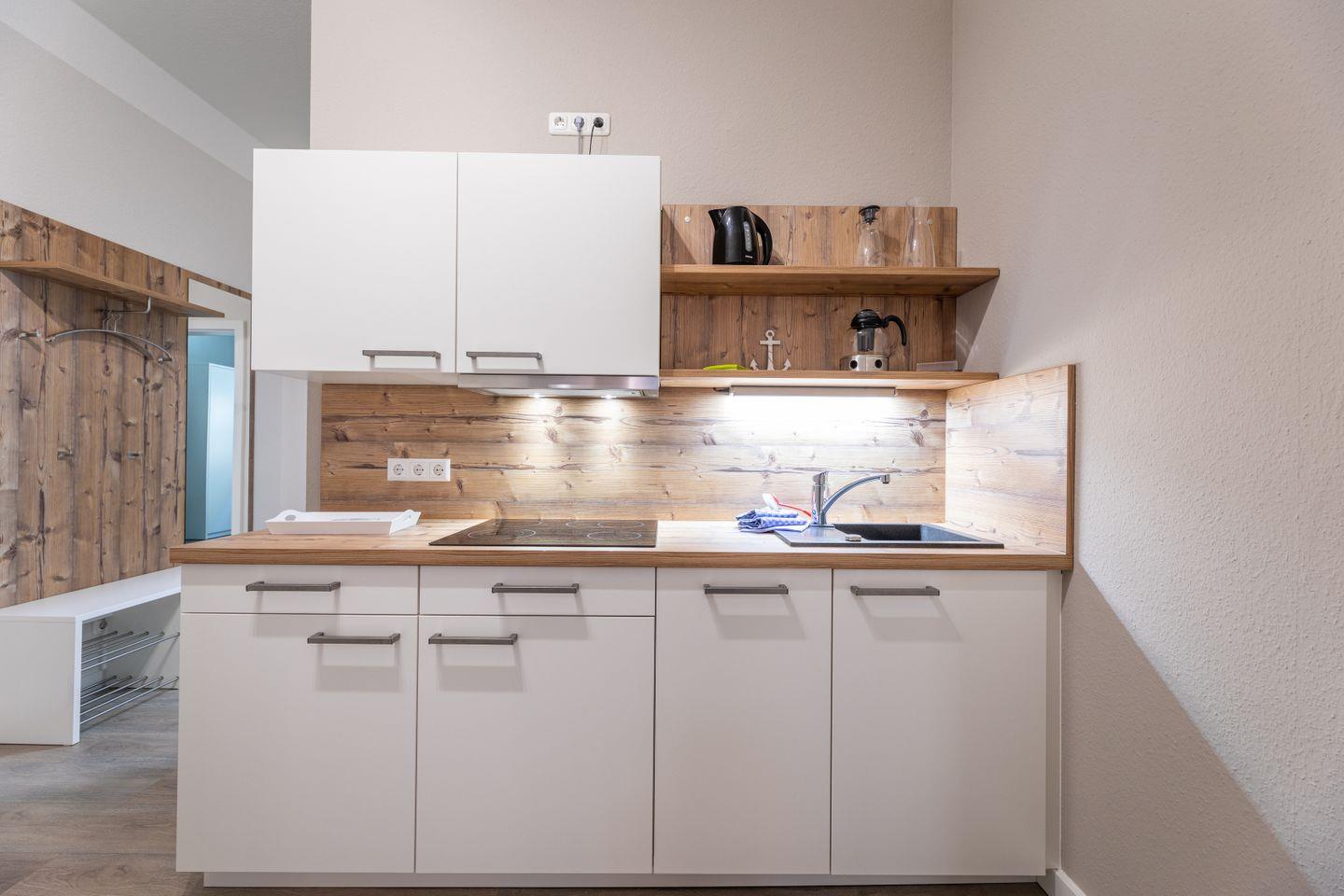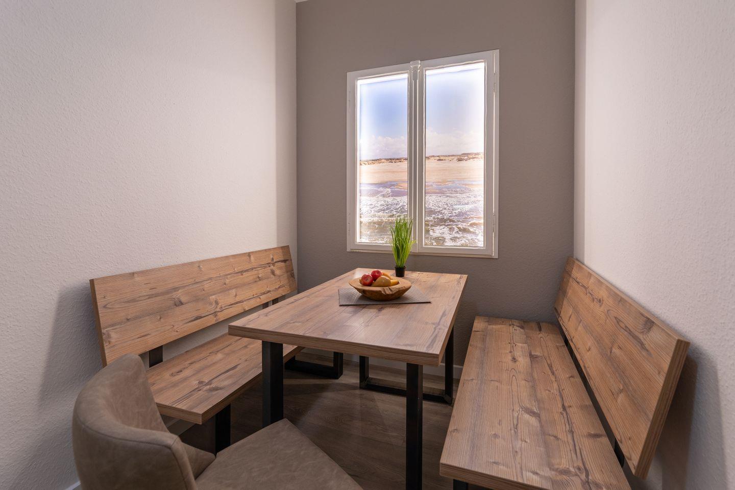 Kajüte 8 im Ferienhaus Inselanker erstrahlt seit der Renovierung 2021 im modernen maritimen Stil – hell, freundlich und gemütlich. Die 1-Zimmer-Wohnung auf 30?m² in der 1. Etage bietet Platz für 2 Personen. Der Wohn-/Schlafbereich überzeugt mit Sofa (als Schlafsofa 190×190?cm), Cocktailsessel und TV, während die offene, gut ausgestattete Küchenzeile zu gemeinsamen Mahlzeiten einlädt. Das Bad mit Dusche und WC ist innenliegend und modern eingerichtet. Ein Highlight ist das beleuchtete Holzfenster, das einen stimmungsvollen Blick auf die Insel bietet. Plissees und Außen-Rollo sorgen für Sichtschutz und Verdunkelung – ideal für einen entspannten Urlaub mit Sonne, Strand und echtem Norderneyer Urlaubsgefühl.