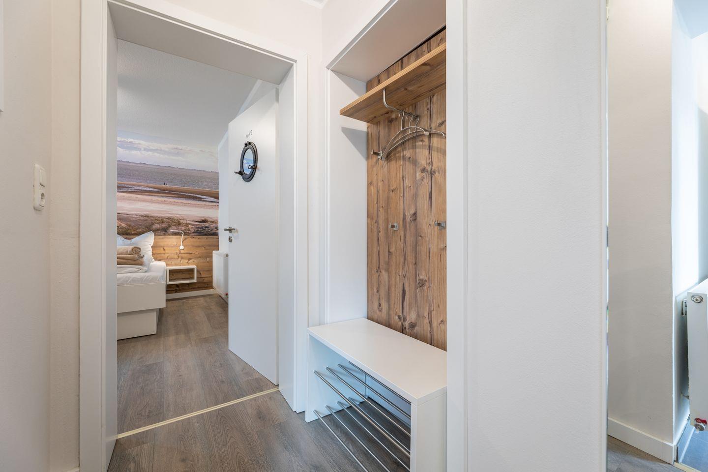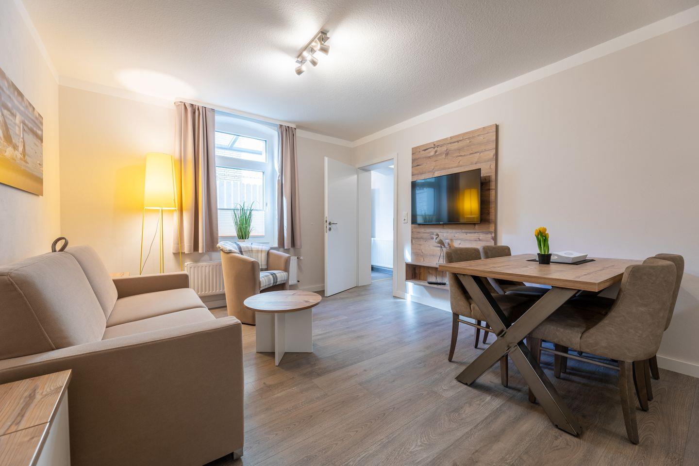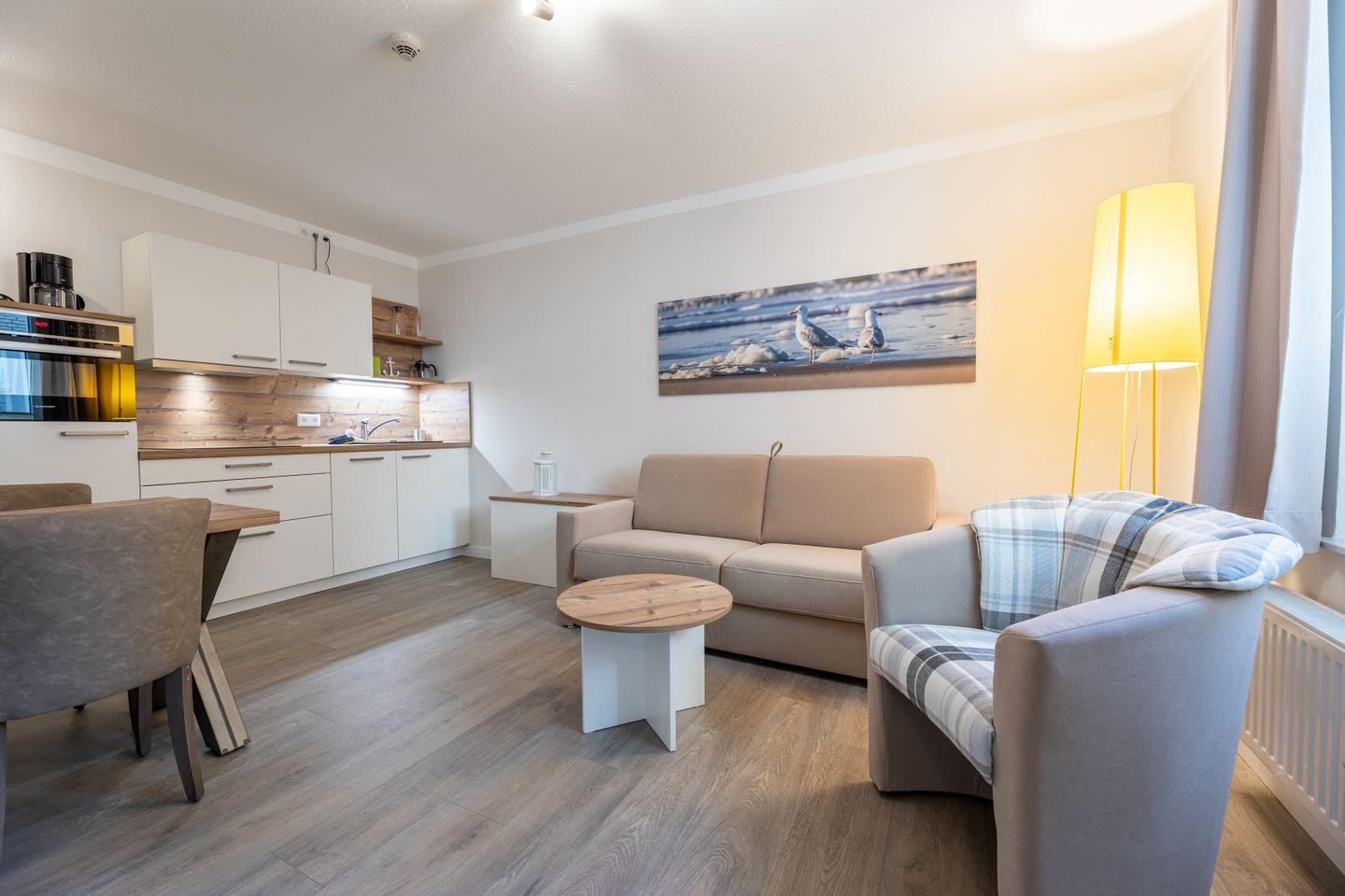 Kajüte 9 im Ferienhaus Inselanker erstrahlt seit der Renovierung 2021 im modernen maritimen Stil – hell, freundlich und gemütlich. Die Wohnung im Souterrain auf 41?m² bietet Platz für bis zu 4 Personen, auch mit Hund. Sie verfügt über ein Schlafzimmer mit Doppelbett (optional Babybett) und einen Wohnbereich mit Sofa (als Schlafsofa 170×190?cm), Cocktailsessel und TV. Die voll ausgestattete Küchenzeile mit Essplatz lädt zu gemeinsamen Mahlzeiten ein, das Bad mit Dusche/WC ist modern eingerichtet. Plissees und Übergardinen sorgen für Sichtschutz und Verdunkelung – ideal für Familien oder Freunde, die ein entspanntes Norderneyer Urlaubsgefühl genießen möchten.