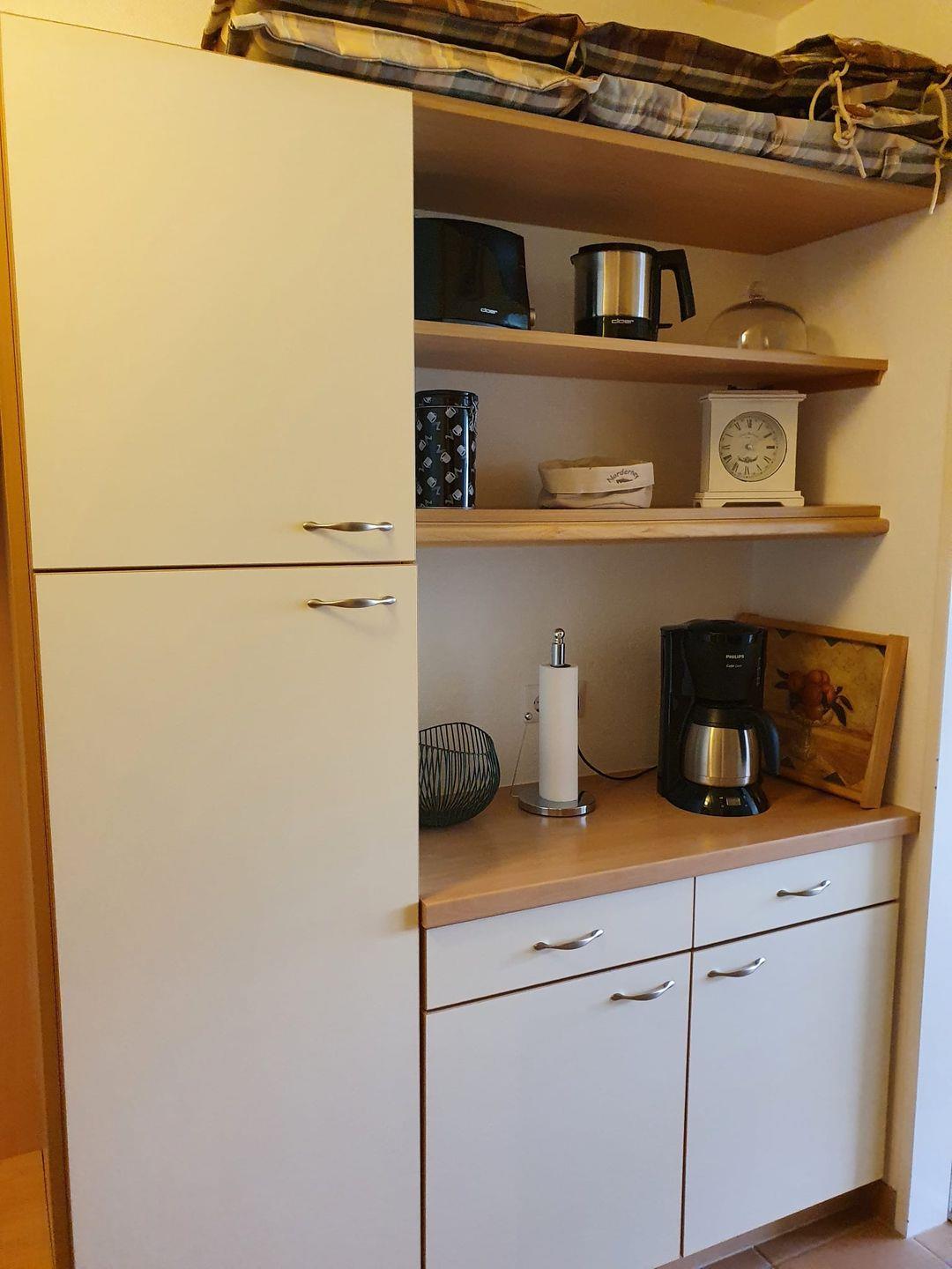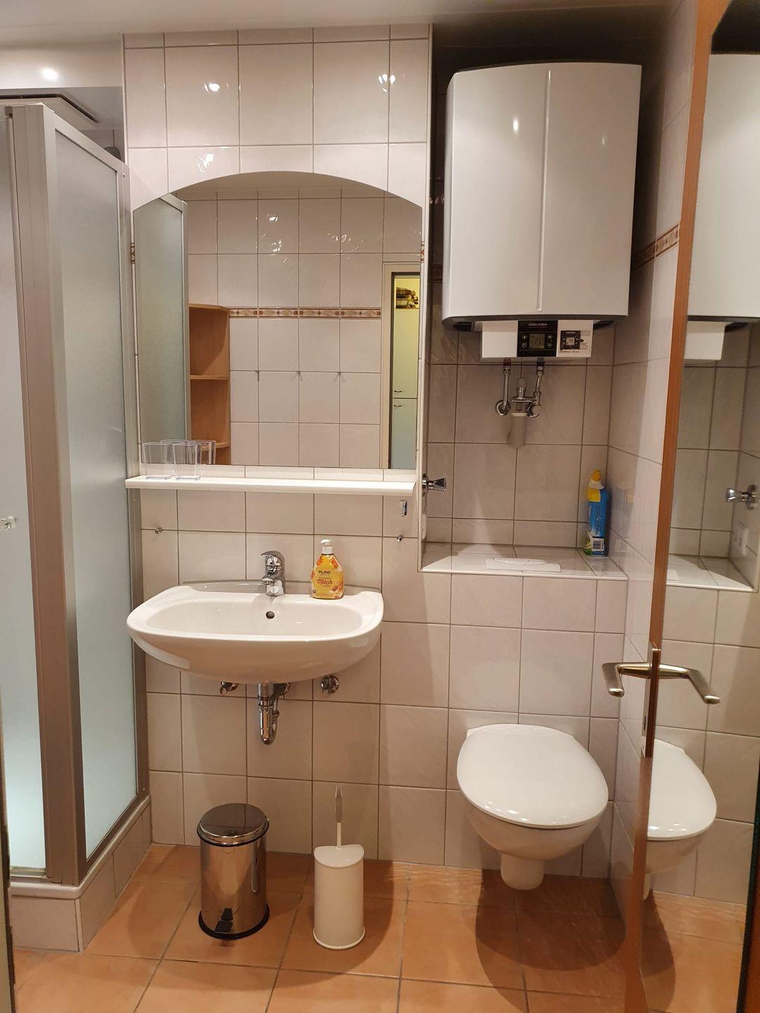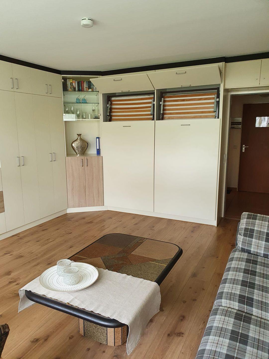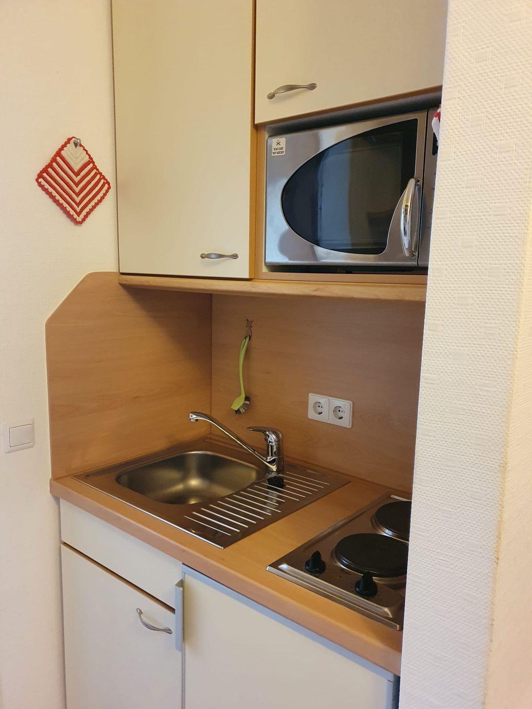 Die Wohnung selbst besticht durch ein modernes, helles Design. Die Küchenzeile ist mit einem Zweiplattenherd und einer Mikrowelle ausgestattet. Im Badezimmer befinden sich Dusche und WC. Besonders praktisch ist das Schrankbett, das sich tagsüber verstauen lässt und so für mehr Bewegungsfreiheit sorgt.