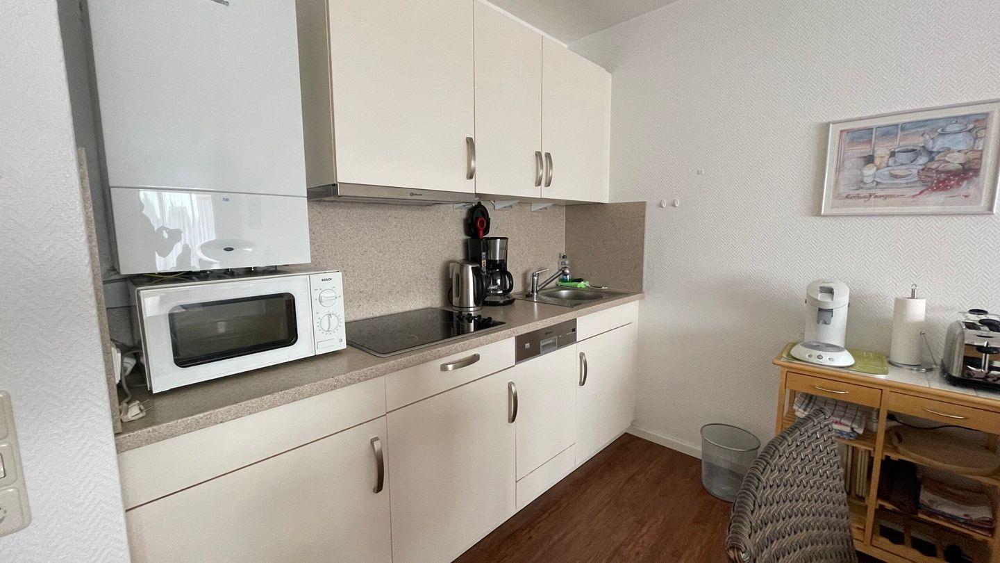Das helle, großzügige 1-Raum-Apartment im Hochparterre verfügt über einen Wohn-/Schlafraum mit gemütlichem Doppelbett, Küchenzeile, Essbereich sowie Badezimmer mit Dusche/ WC. Als Highlight bietet die Wohnung einen schönen Südbalkon, zwei eigene Fahrräder sowie einen PKW-Stellplatz hinter dem Haus. Im Keller stehen Münzwaschmaschine und Trockner zur Mitbenutzung bereit.