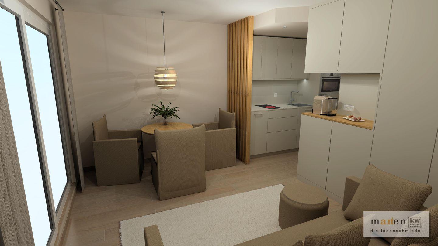 Die Wohnung verfügt über ein Schlafzimmer mit Doppelbett. Das Wohnzimmer ist mit einer voll eingerichteten Küchenzeile ausgestattet. Das Bad mit Dusche und WC rundet das Raumangebot ab. Ein Highlight der Wohnung ist der etwa 9 Quadratmeter große Balkon. Waschmaschine und Wäschetrockner befinden sich im Haus und stehen (für die gemeinschaftliche Nutzung gegen Münzeinwurf) zur Verfügung, was besonders für längere Aufenthalte von Vorteil ist. Hunde sind in dieser Ferienwohnung nicht erlaubt.