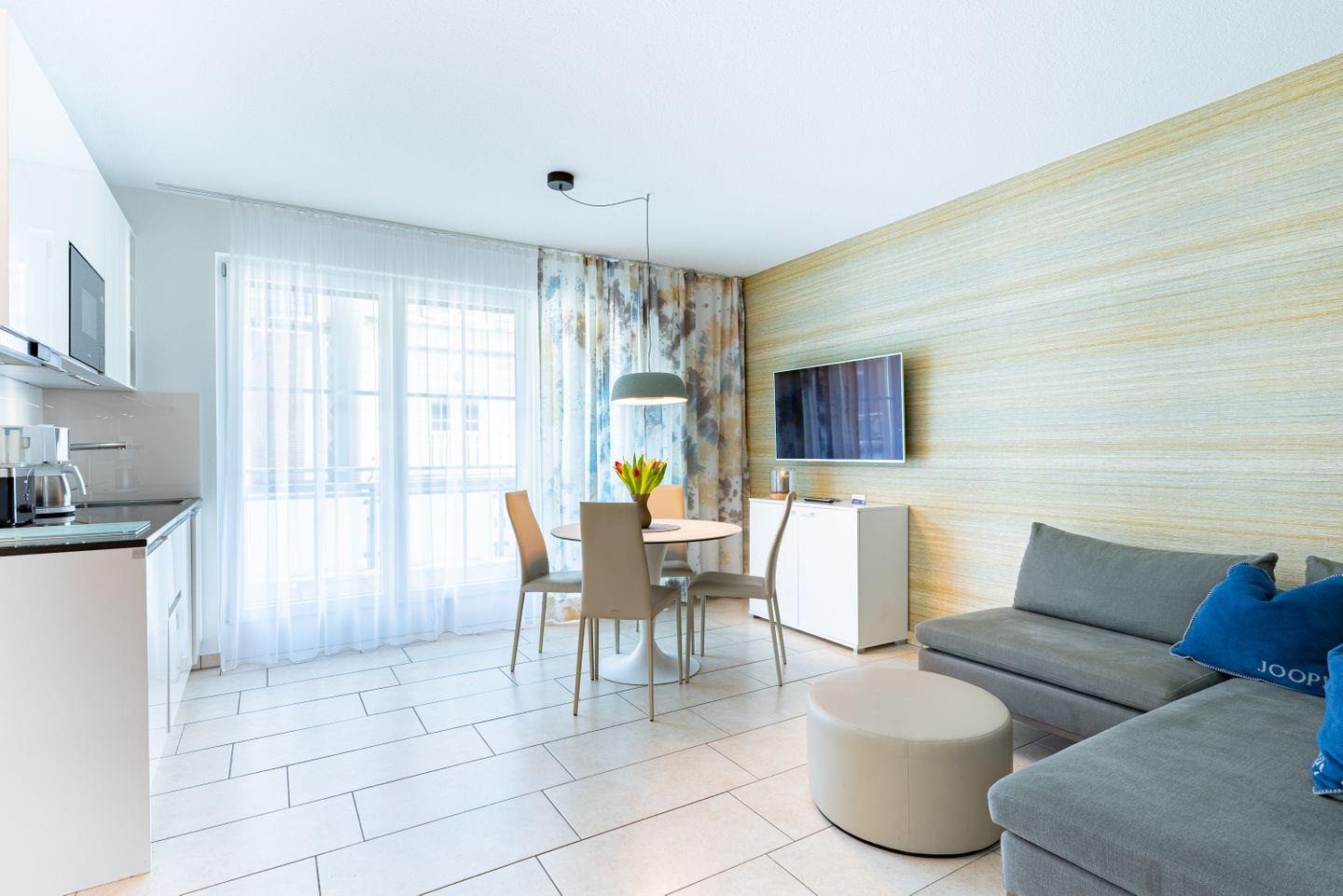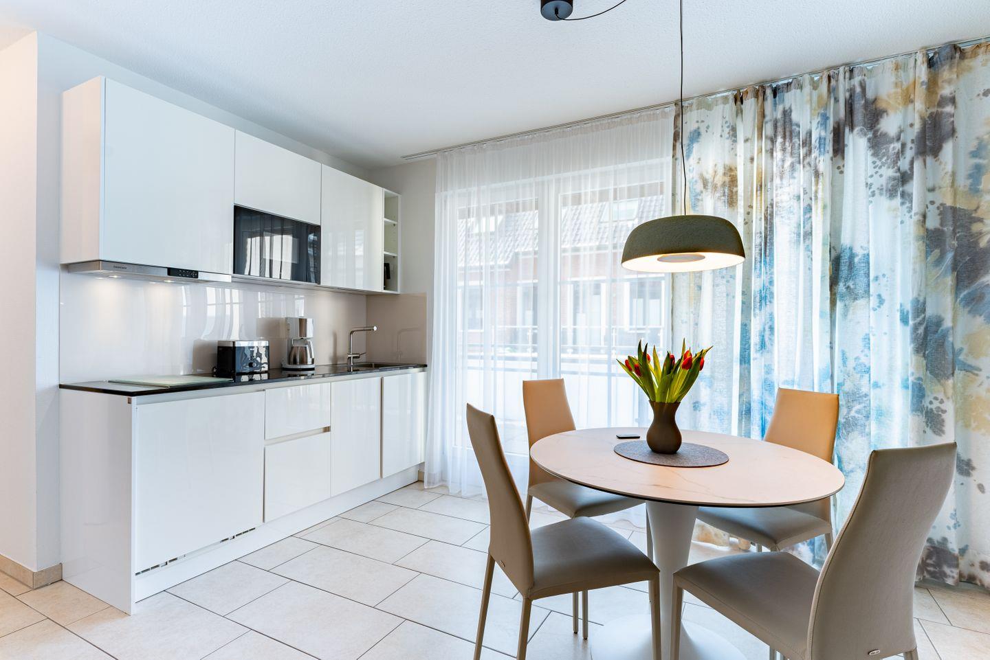 Die Wohnung bietet auf 42 Quadratmetern alles, was drei Personen für einen entspannten Inselurlaub brauchen. Die Küche ist offen zum Wohnbereich gestaltet, sodass man beim Kochen nicht abgeschnitten ist vom Rest. Kaffeemaschine, Wasserkocher, Mikrowelle, Toaster und Spülmaschine sind vorhanden, der Morgen kann also ohne Aufwand starten. Im Schlafzimmer steht ein erhöhtes Doppelbett, der zweite Schlafbereich bietet ein erhöhtes Schlafsofa. Bettwäsche und Handtücher werden gestellt, damit du mit leichtem Gepäck anreisen kannst.