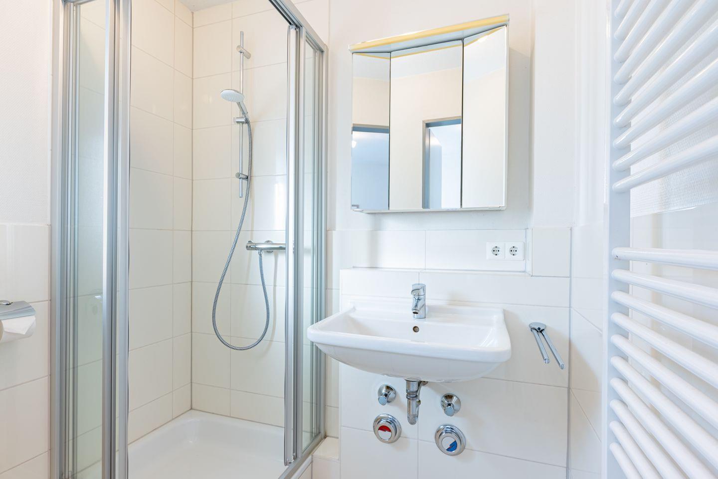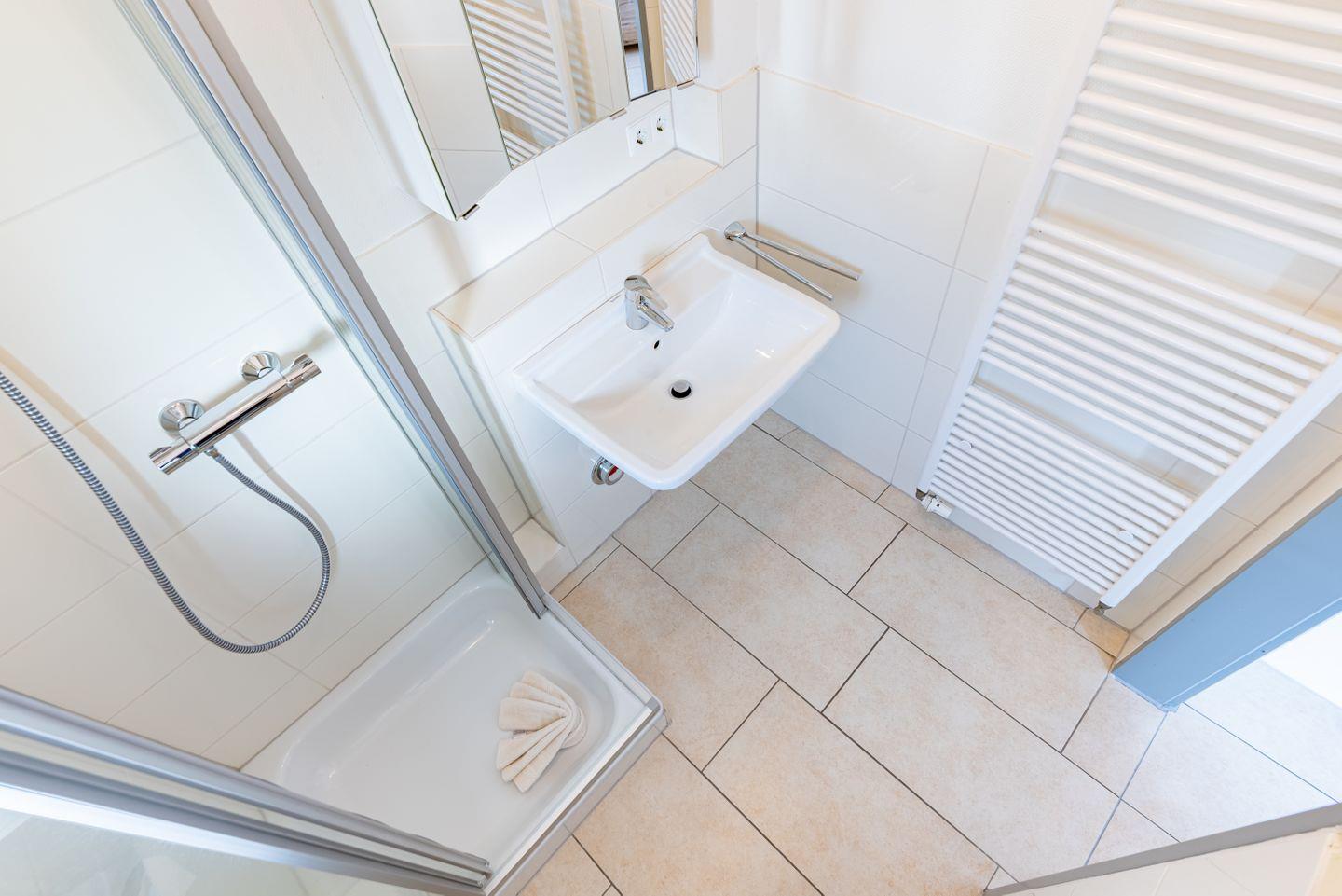 Das Badezimmer verfügt über eine Dusche in der Badewanne, WC und Waschbecken. Ein Fenster, Spiegel und Haartrockner sind vorhanden. Für längere Aufenthalte kannst Du Waschmaschine und Trockner gemeinschaftlich nutzen. Zusätzlich stehen Dir ein Wäscheständer und ein Staubsauger zur Verfügung.