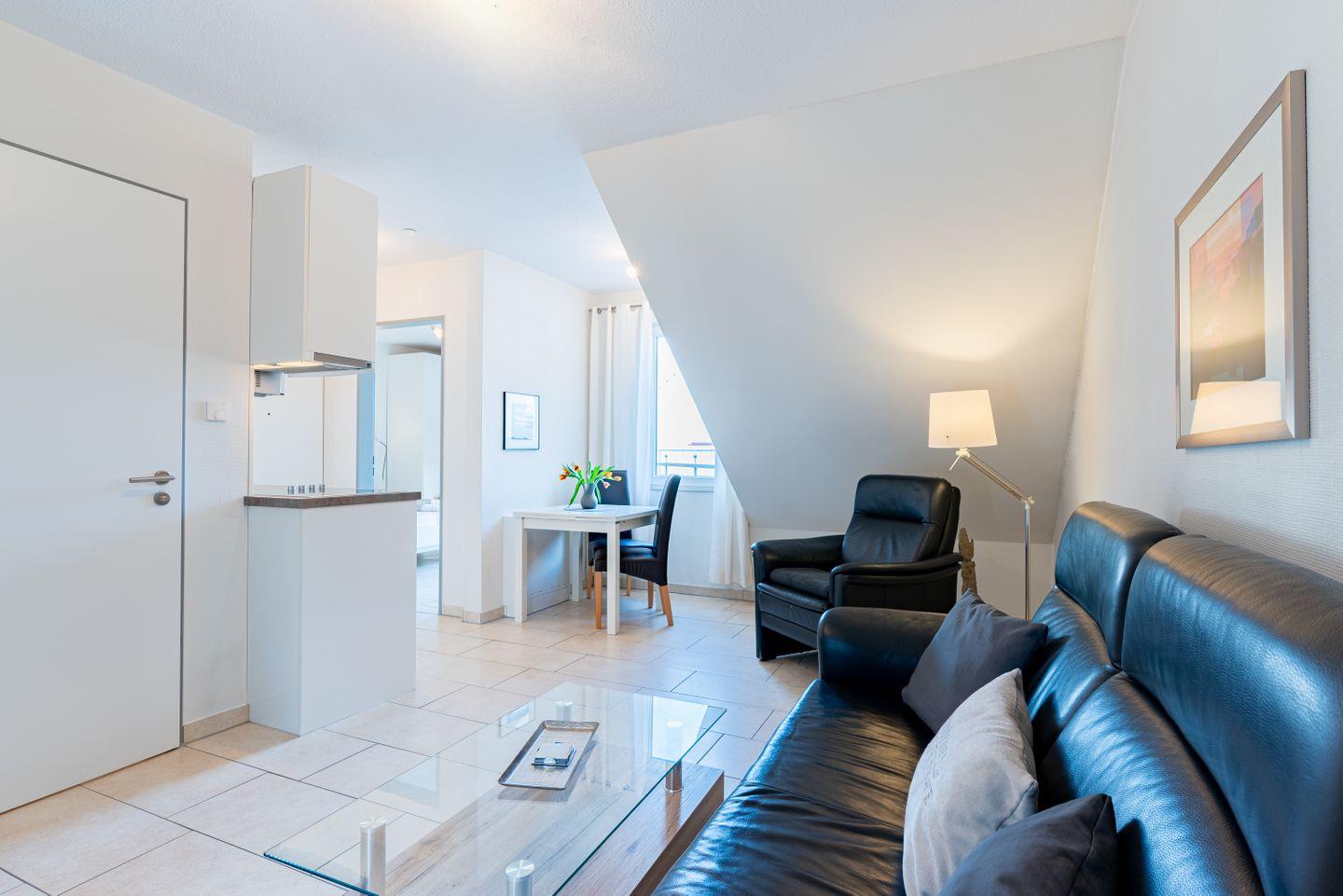Die 2 Zimmer teilen sich in ein Schlafzimmer und ein Wohnzimmer mit gemütlicher Sofaecke und Essbereich auf. Fliesen in Schlaf- und Wohnbereich sorgen für ein klares, pflegeleichtes Wohngefühl. Für angenehme Temperaturen stehen Dir eine Heizung sowie eine Fußbodenheizung zur Verfügung. Im Wohnbereich findest Du Sofa, Sessel, Esstisch sowie praktische Details wie Kommode, Garderobe und einen Ganzkörperspiegel. Ein TV mit Kabelanschluss ist ebenfalls vorhanden.