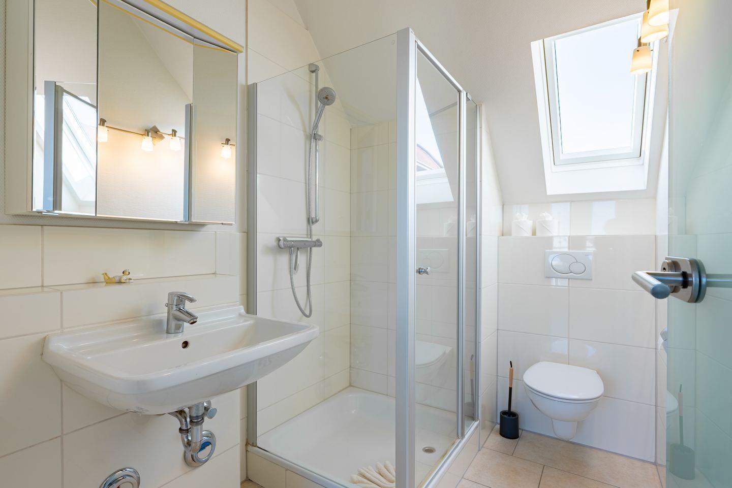 Das Badezimmer verfügt über eine Dusche, WC, Waschbecken, Spiegel, Fenster und Haartrockner. Für längere Aufenthalte kannst Du Waschmaschine und Trockner gemeinschaftlich nutzen. Auf dem Balkon laden Gartenmöbel und Windschutz zum Entspannen ein. Ein Supermarkt befindet sich in der Nähe und ist bequem erreichbar.