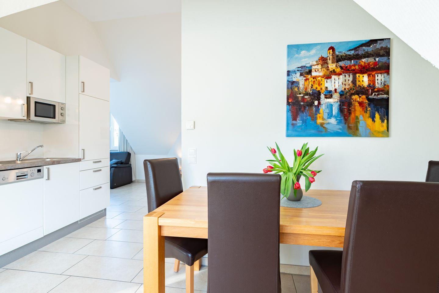 In der separaten Küche mit Esstisch lässt sich der Tag gemütlich beginnen: Kaffeemaschine, Wasserkocher und Toaster stehen bereit, Backofen, Mikrowelle und Spülmaschine machen das Kochen angenehm unkompliziert. Wer lieber draußen isst, findet direkt vor der Tür eine Auswahl an Restaurants und Cafés. Für längere Aufenthalte sind Waschmaschine und Trockner in der Wohnung vorhanden, sodass du mit weniger Gepäck reisen kannst.