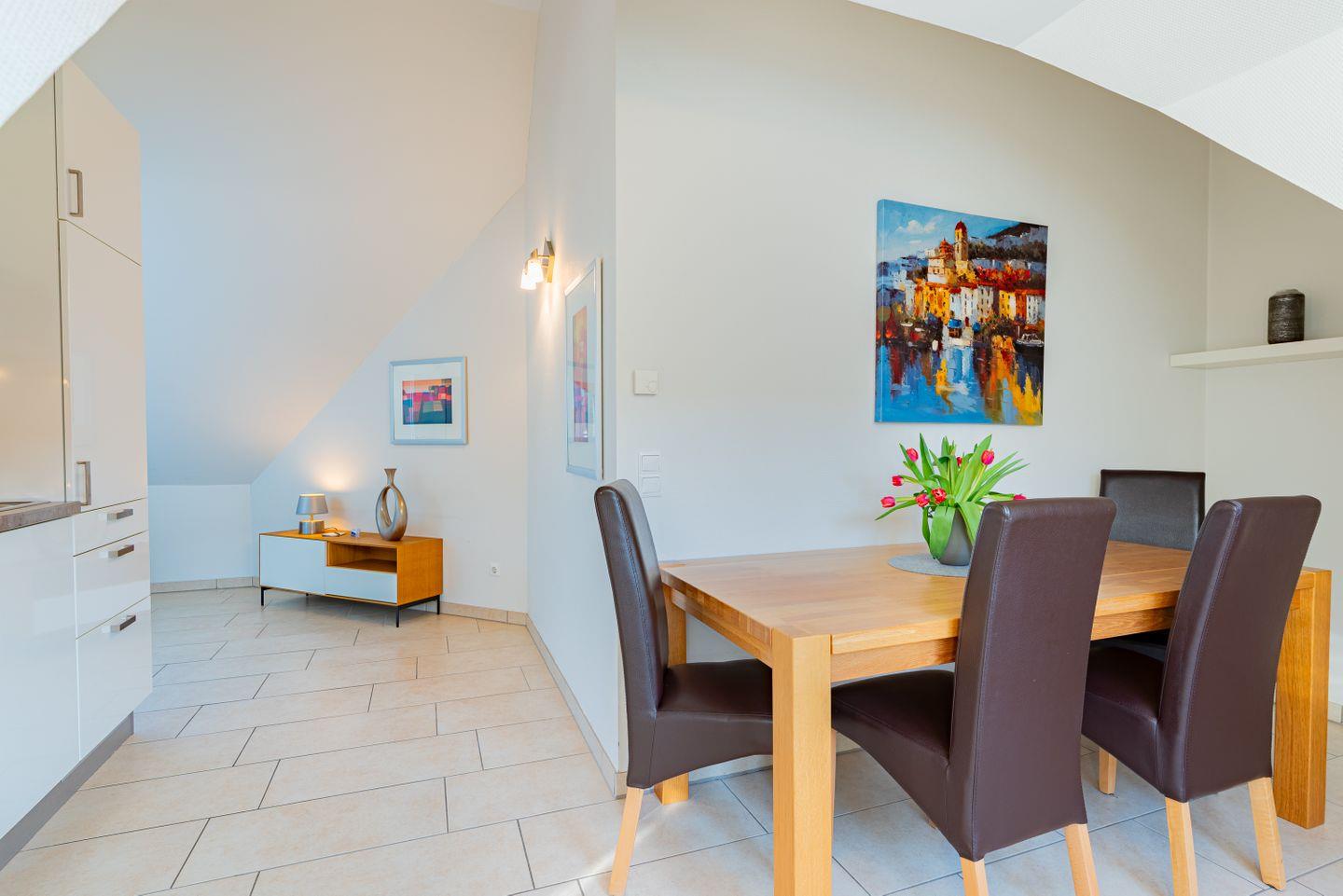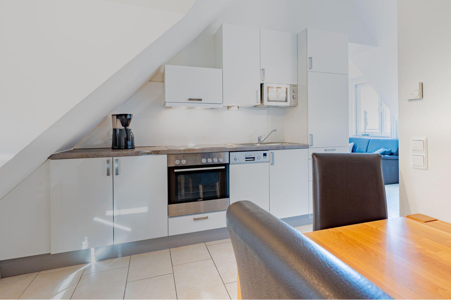 Die geschlossene Küche mit Esstisch ist vollständig für die Selbstversorgung ausgestattet. Dir stehen ein Ceran-Herd, Backofen, Mikrowelle, Kühlschrank mit Gefrierfach und eine Spülmaschine zur Verfügung. Kaffeemaschine, Wasserkocher, Toaster sowie Geschirr, Besteck und Küchenutensilien runden die Ausstattung ab. Für gemeinsame Mahlzeiten gibt es einen separaten Essbereich mit Esstisch.