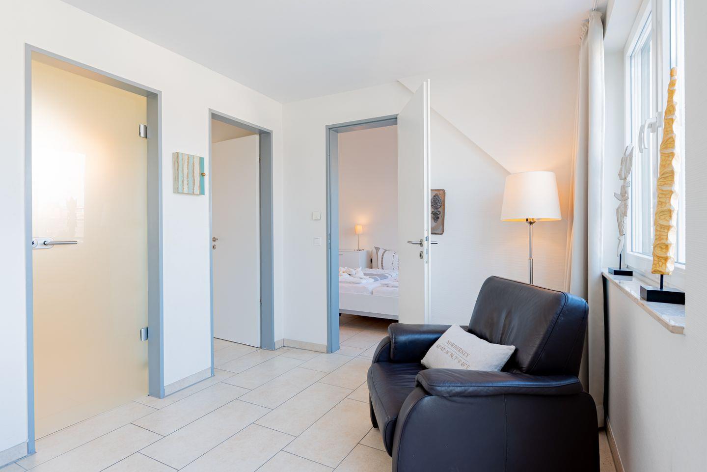 Der Wohnbereich ist gemütlich mit Sofaecke, Sofa und Sessel eingerichtet. Für Unterhaltung und Komfort stehen Dir ein TV mit Kabelanschluss sowie WLAN zur Verfügung. Fliesen in Wohn- und Schlafbereichen sorgen für ein gepflegtes Wohngefühl, Heizung und Fußbodenheizung für angenehme Temperaturen. Praktische Ausstattungsdetails wie Garderobe, Kommode, Ganzkörperspiegel, Wäscheständer, Staubsauger und Rauchmelder sind ebenfalls vorhanden.