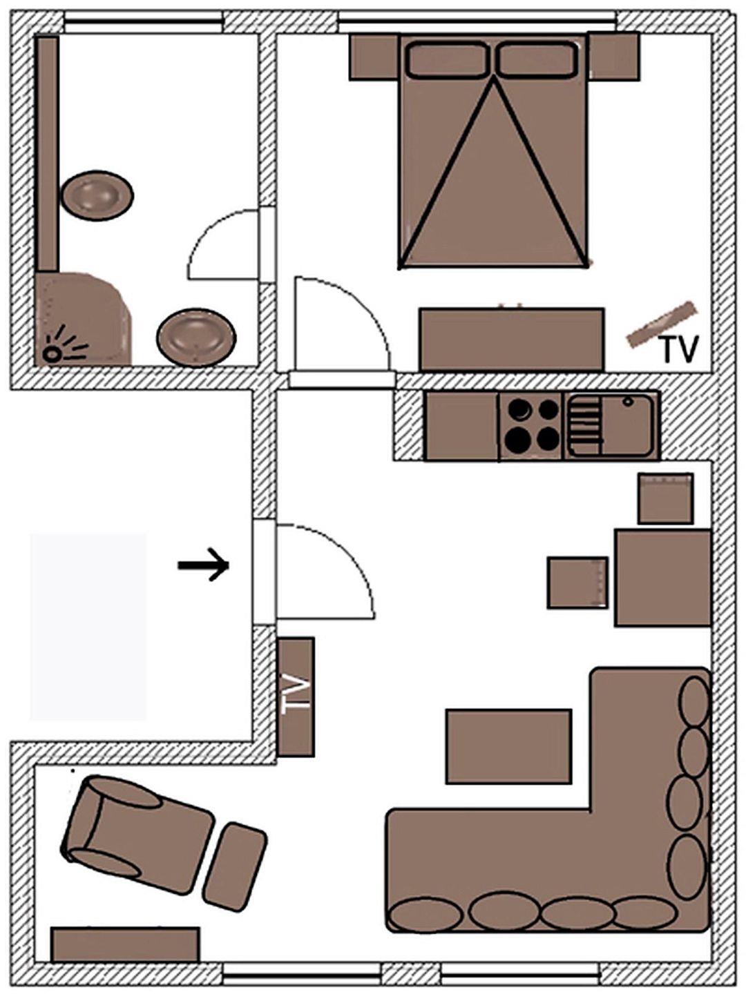 Die Wohnung verfügt über insgesamt 2 Zimmer: ein separates Schlafzimmer und ein Wohnzimmer mit Sofaecke sowie Essbereich. Vinylböden sorgen in Wohn- und Schlafbereich für eine angenehme, pflegeleichte Atmosphäre. Für entspannte Abende stehen Ihnen zwei Fernseher (35–44 Zoll) mit digitalem Kabelanschluss zur Verfügung; außerdem sind Radio, Internet und WLAN vorhanden. Praktische Details wie Garderobe, Schuhschrank, Kommode, Ganzkörperspiegel, Wecker, Bücher, Staubsauger und ein Wäscheständer ergänzen die Ausstattung.