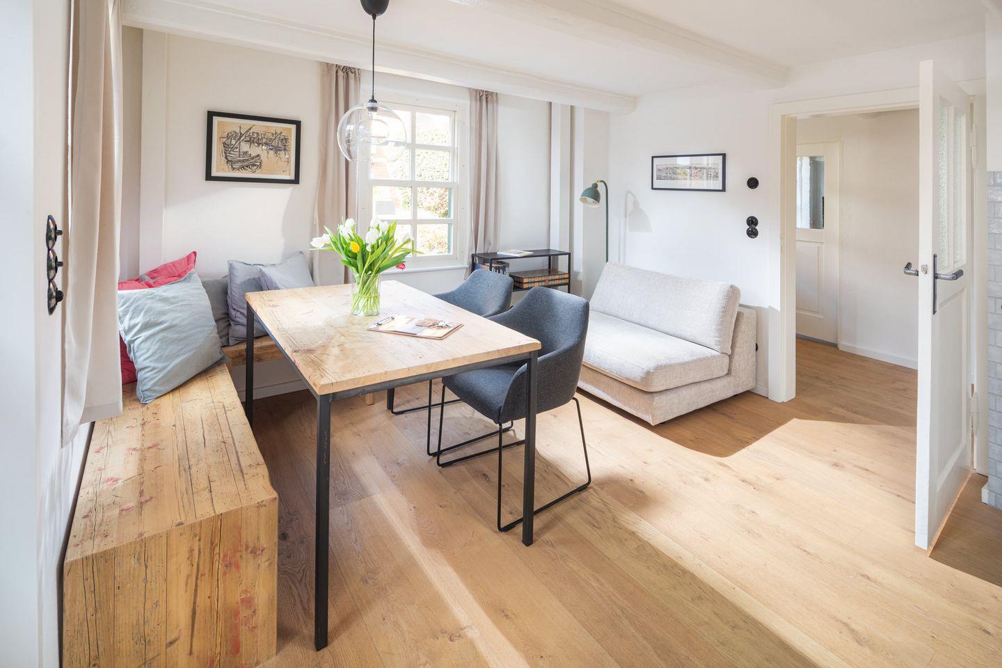 Mit rund 47 m² Wohnfläche bietet das Haus Platz für bis zu 3 Personen. Es verfügt über ein Schlafzimmer mit einem Doppelbett (160 x 200 cm) sowie ein weiteres, kleineres Schlafzimmer mit einem Einzelbett (90 x 200 cm). Das kleinere Schlafzimmer ist direkt an das große Schlafzimmer angeschlossen und ausschließlich über dieses zu erreichen – eine charmante, historische Raumlösung, wie sie in alten Fischerhäusern typisch war. Ergänzt wird das Raumangebot durch ein modernes Badezimmer mit bodengleicher Dusche sowie die zentrale Wohnküche. Das Haus wurde 2025 umfassend renoviert.
