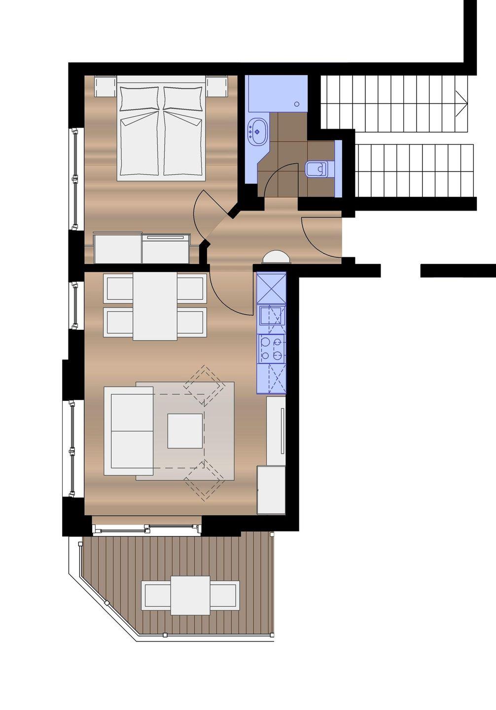 Die Wohnung verfügt über ein Schlafzimmer mit einem Doppelbett. Das Wohnzimmer bietet eine Schlafcouch, die Platz für bis zu zwei weitere Personen bietet. Damit eignet sich die Wohnung ideal für Familien oder kleine Gruppen. Die Küchenzeile ist gut ausgestattet. Das Badezimmer mit Dusche und WC ist modern gestaltet. Ein Highlight der Wohnung ist der 7 Quadratmeter große Balkon. Waschmaschine und Wäschetrockner befinden sich im Haus und stehen (für die gemeinschaftliche Nutzung gegen Münzeinwurf) zur Verfügung, was besonders für längere Aufenthalte von Vorteil ist. Hunde sind in dieser Ferienwohnung nicht erlaubt.