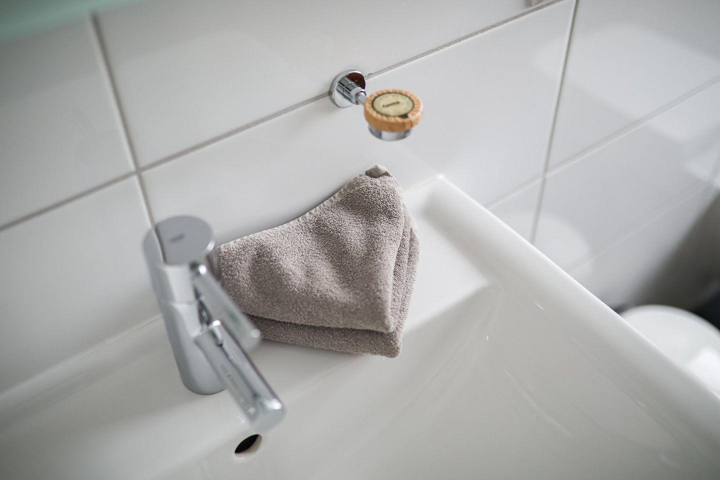 Zwei Badezimmer sorgen für Komfort auch bei voller Belegung. Das größere Bad ist mit zwei Waschbecken, einer bodengleichen Dusche, einer Badewanne und einem WC ausgestattet. Ein Fenster ermöglicht Tageslicht und frische Seeluft. Haartrockner und Kosmetikspiegel gehören zur Ausstattung. Die Raumaufteilung ist durchdacht und bietet ausreichend Platz für Familien oder befreundete Paare.
