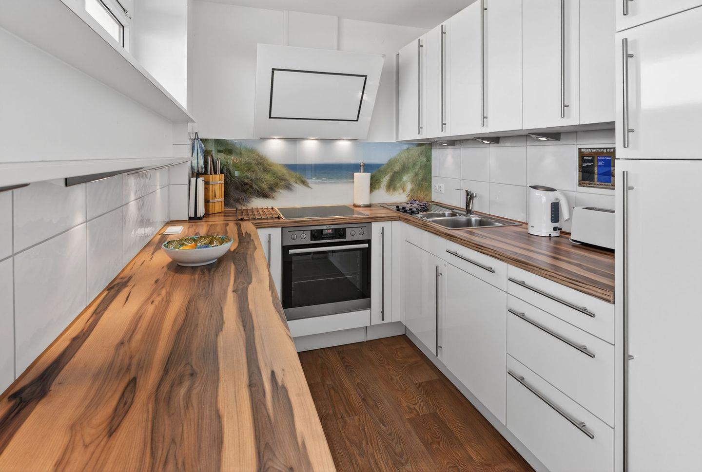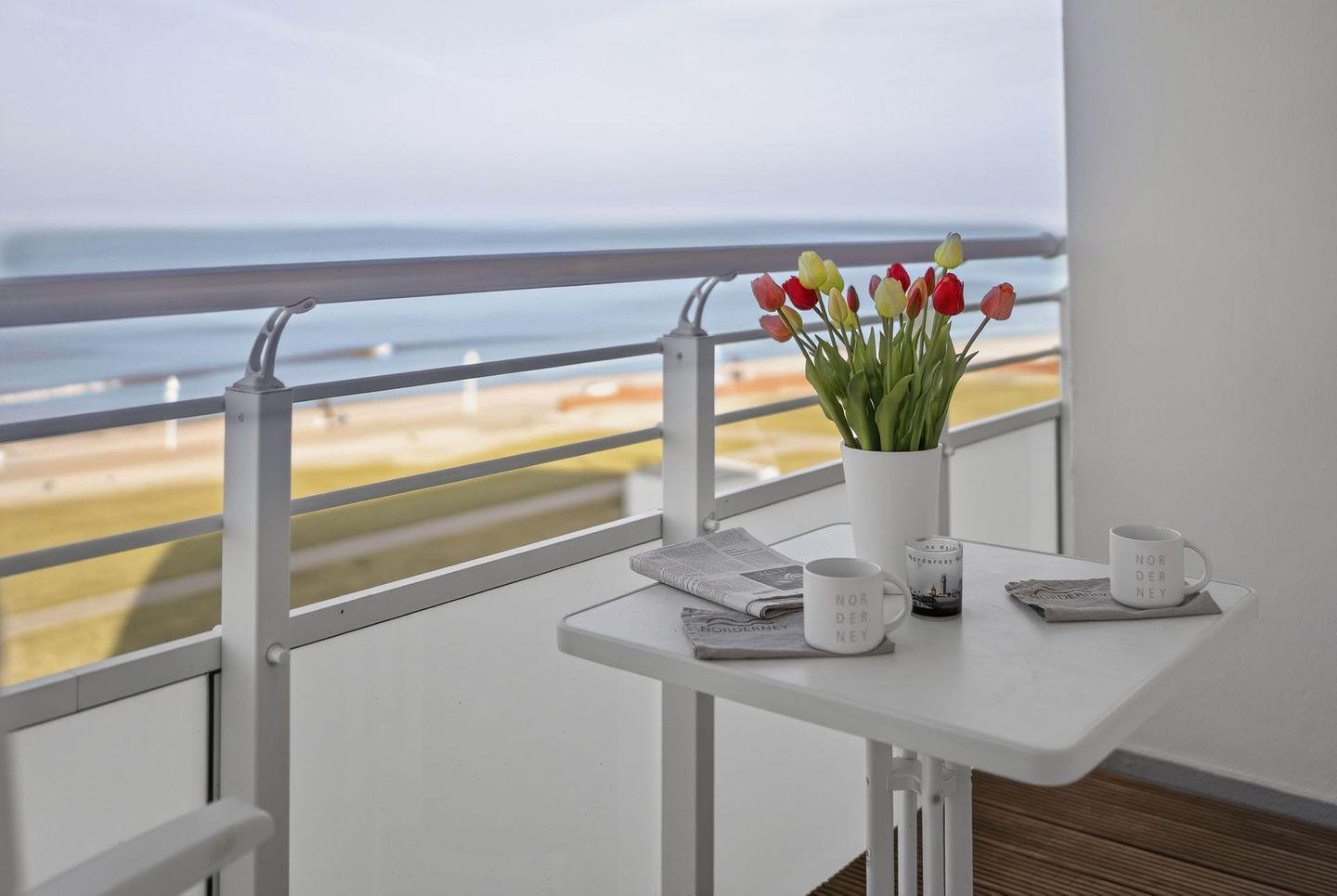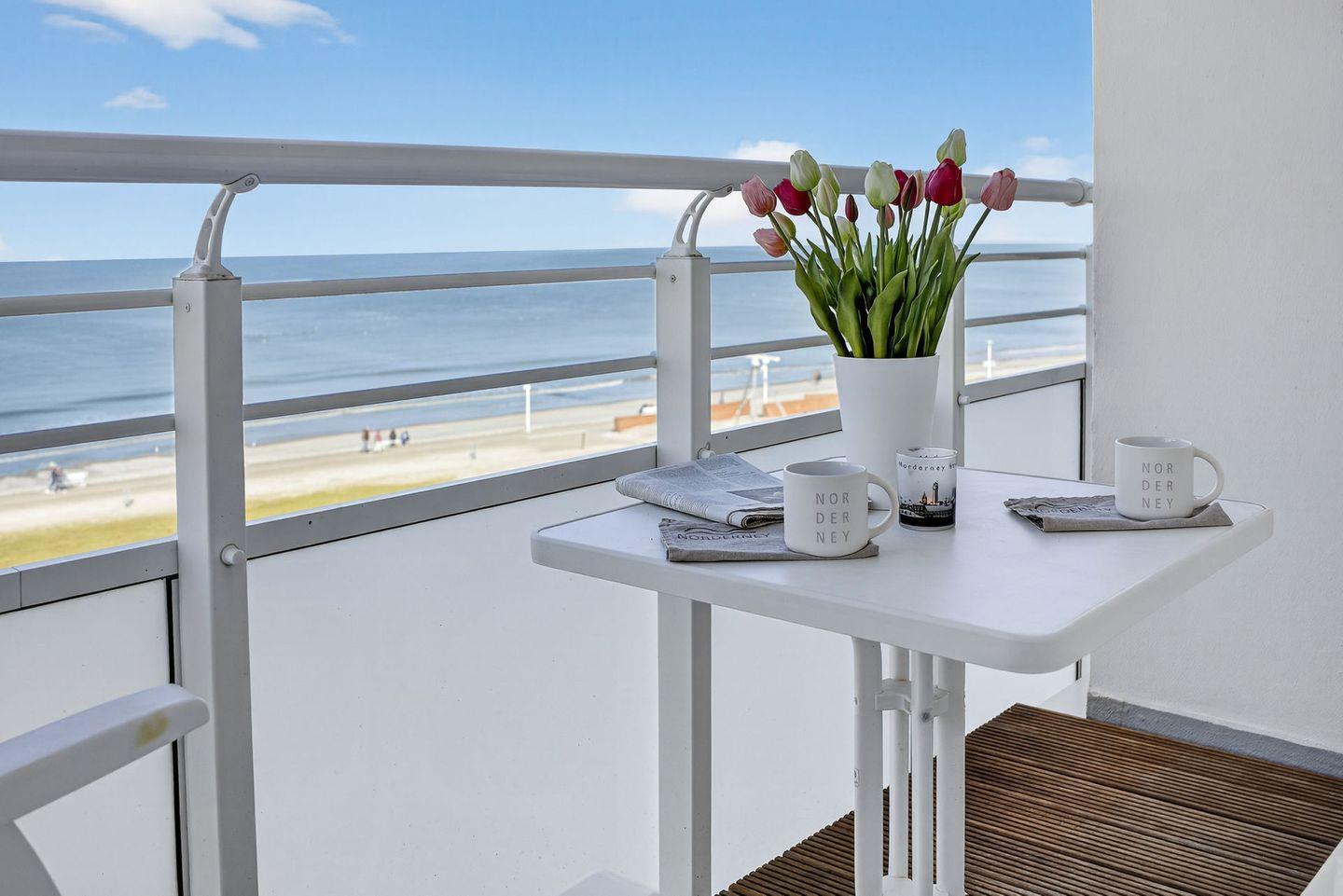 Auch der großzügige, ca. 15 m² große Balkon ist nach Norden ausgerichtet und ermöglicht ebenfalls einen freien Blick auf die Nordsee. Das separate Schlafzimmer ist mit einem Doppelbett ausgestattet; die Matratzen haben das Maß 1,00 x 2,00 m. Durch Jalousien ist eine vollständige Verdunkelung möglich. Die neue Küche ist funktional und hochwertig ausgestattet und verfügt über Geschirrspüler, Backofen und Cerankochfeld sowie über ausreichend Stauraum. Das Badezimmer ist mit einer Dusche ausgestattet; ein Handtuchtrockner (Heizkörper) ist vorhanden. Ein TV steht in der Wohnung zur Verfügung.